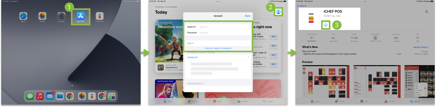 ] in the upper-right corner to sign in with your Apple ID. - Search and download iCHEF POS App.
