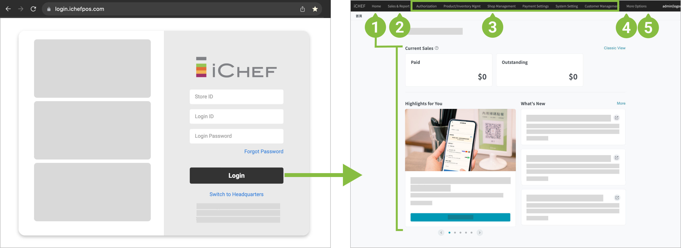 You can access iCHEF’s backend via the browsers on the devices such as computers, iPads or mobile phones. In the backend, you can set up various functions and checking sales reports, and also catch up with the latest news from iCHEF !
