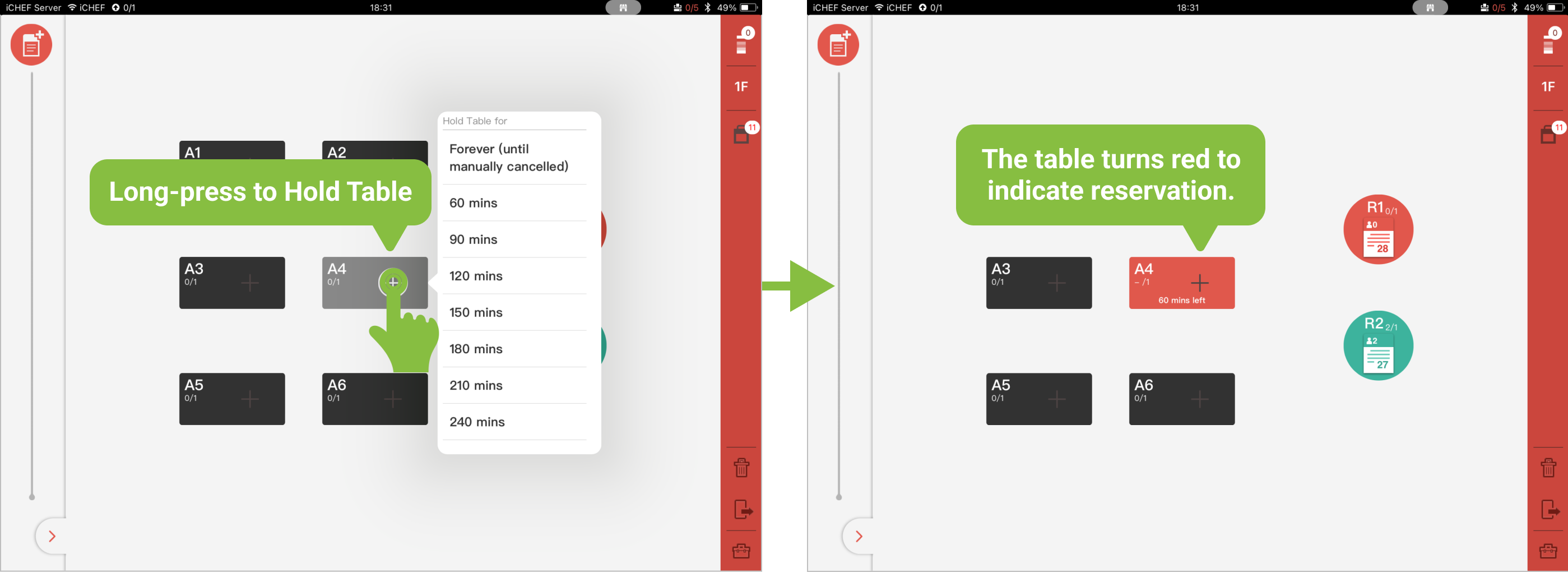 When the holding time is up, the table will automatically become available again. You can also manually cancel the holding status by long-pressing the table again. Learn More