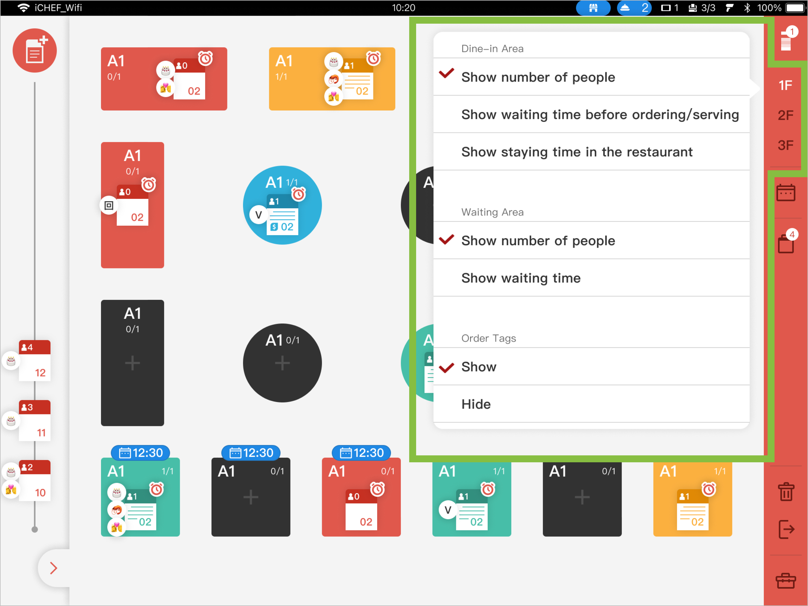 Click the area tag to adjust the display information for the Dine-in Area and Waiting Area.Learn More