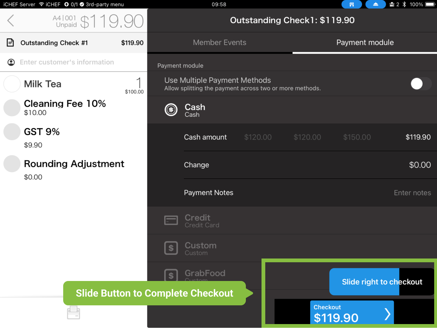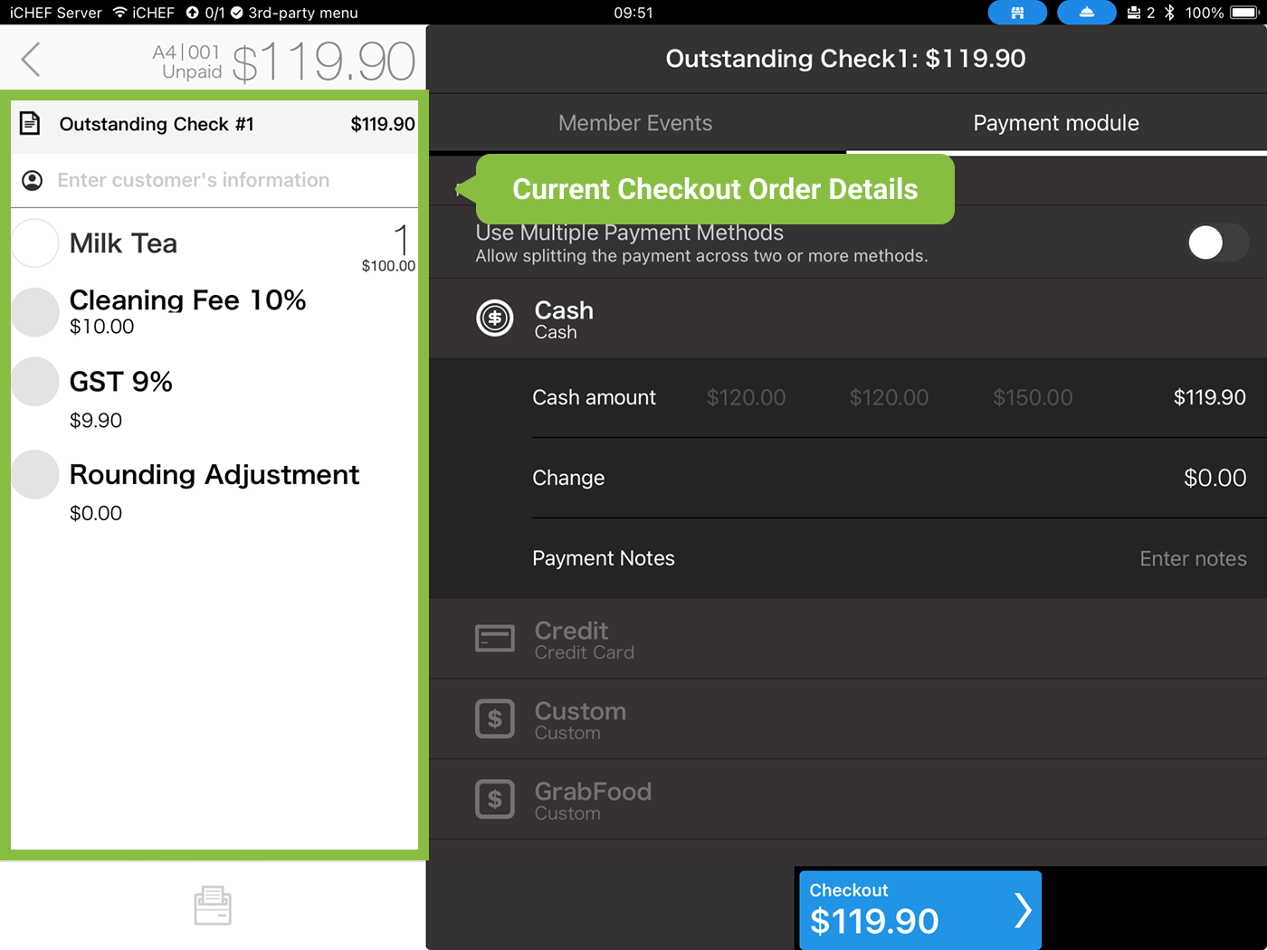 (Taiwan only) Besides the default Cash and Credit Card payment modules, iCHEF also supports mPOS Card Reader integration and mobile payment. At checkout, you can scan customers’ payment barcode directly using the iPad camera or scanner. (Learn more: Multiple Payment Methods)