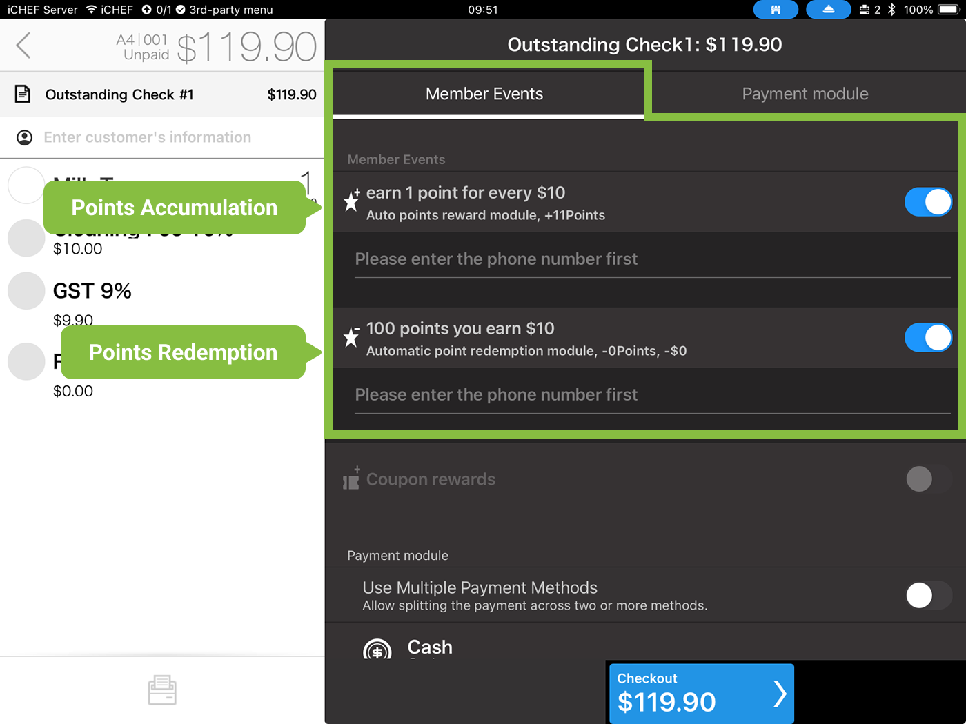 This article illustrates the layout of the checkout page on iCHEF POS, including enabling/disabling the loyalty points program and selecting a payment module.
