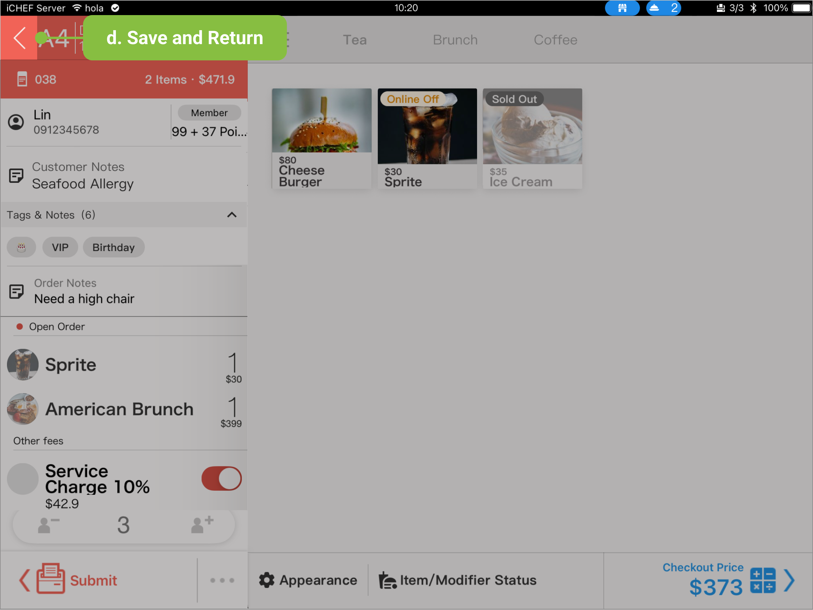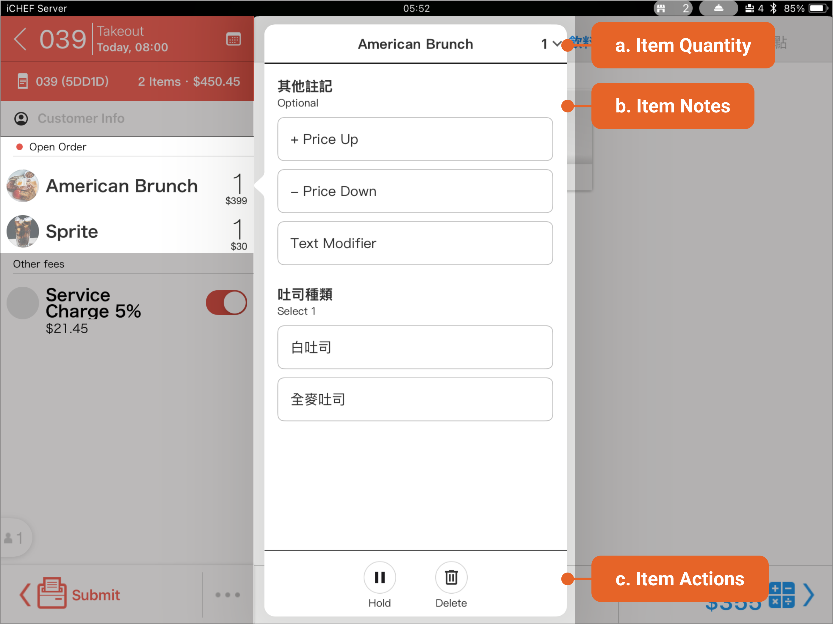 - Item Notes: You can set the item’s notes and price adjustments (add/subtract) before the order is printed.