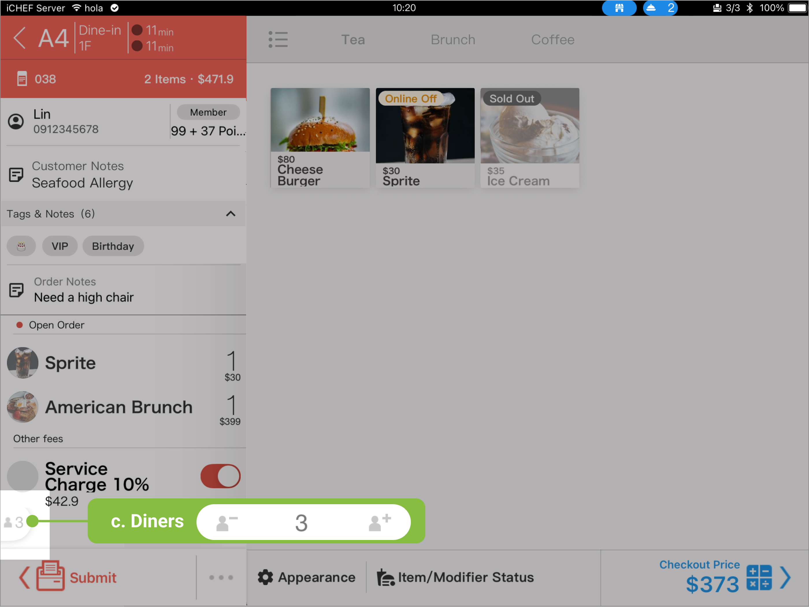 - Diners: Before the order is checked out, tap the avatar icon to edit the number of diners. The inputted number of diners will be reflected in the Diner Analysis report in the Backend, helping you understand your store’s customer composition and average transaction value.