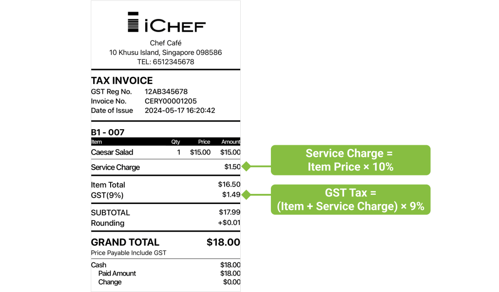 After you successfully registered GST, you will receive the GST registration number for your business, which should be printed on invoices, credit notes and receipts. You can set up your GST information and price displaying, and track the tax amount on iCHEF backend.