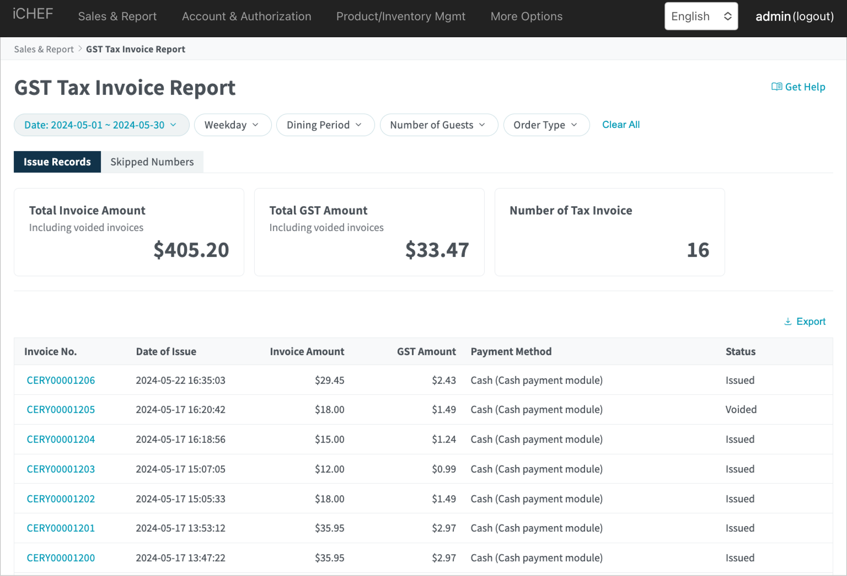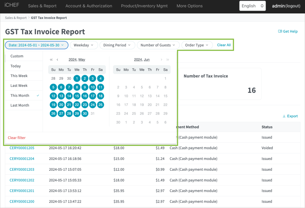 Go to Sales & Reports > GST Tax Invoice Report and you can have an overview of the invoice/receipt record.