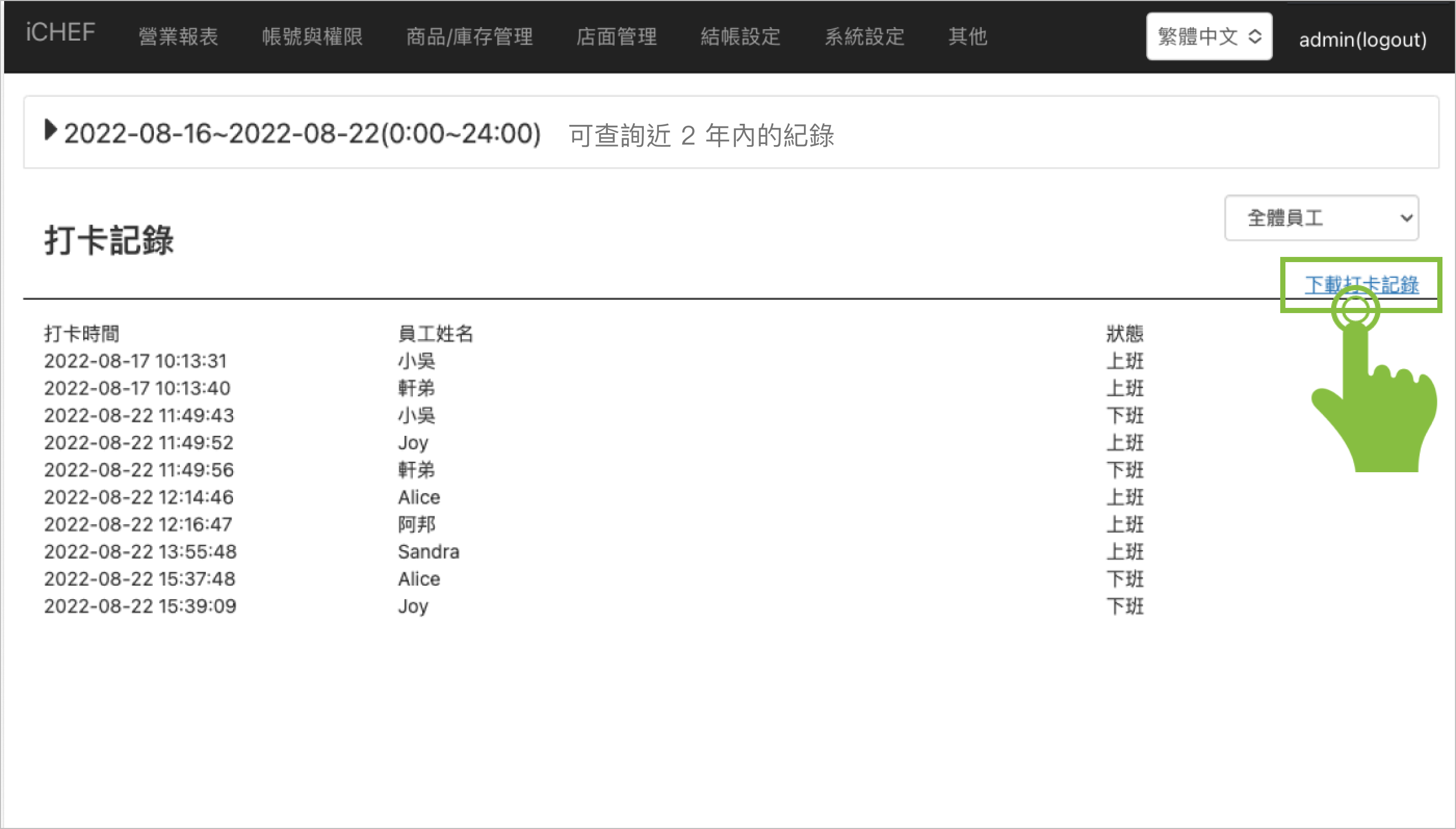 When the employees clock in/out on iCHEF POS, the system will calculate the total working hours of each employee, and you can download the complete records for salary settlement.