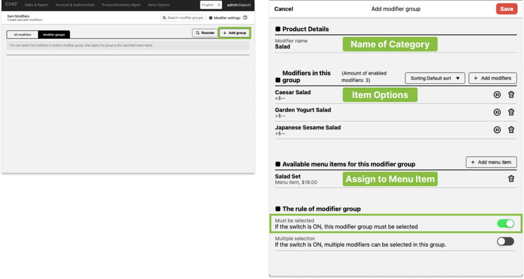 Menu settings on iCHEF backend will be updated to GrabFood ordering page after integrated. There are 3 parts of GrabFood menu settings available on iCHEF backend: menu hours, products, and modifiers.