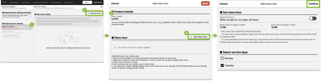 - Go to Integration Settings > GrabFood integration > Menu hour setting