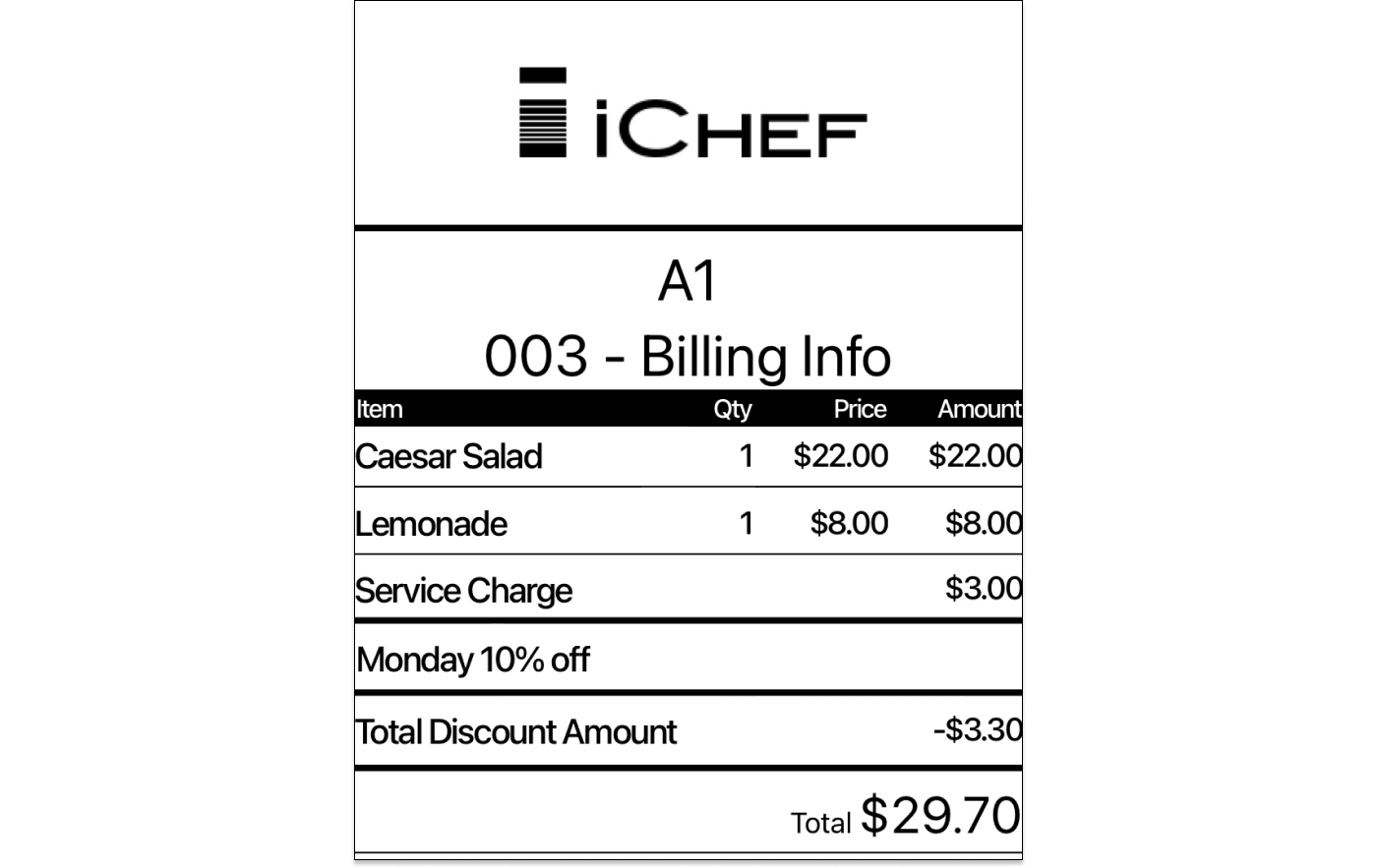 Billing info lists all of the purchased items and total discount amount. You can provide the customers with billing info instead of guest check.