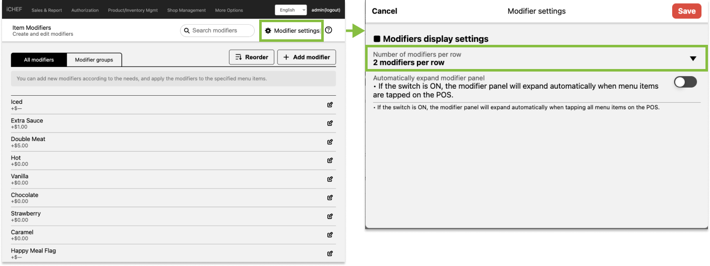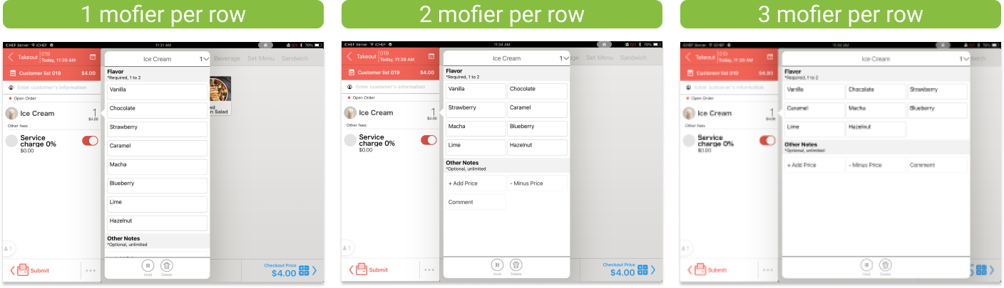 There are 3 options for the setting of modifier display in iCHEF POS app. You can manage it from the page of Restaurant Flow Setting or Modifier Settings. The settings will be synced automatically.