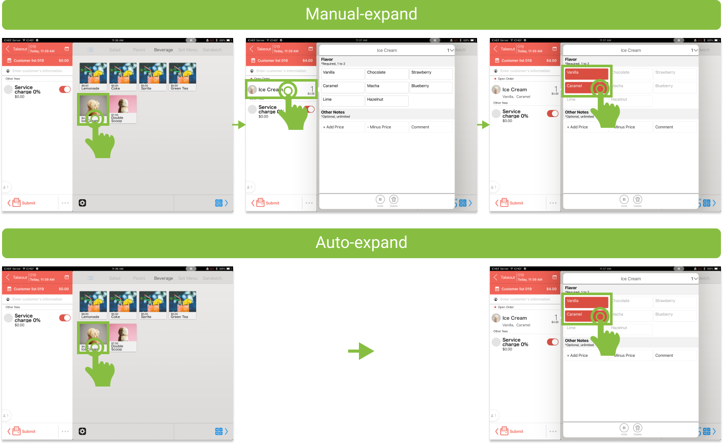 If you enable this function, the system will automatically expand the modifier panel every time you tap an item and add it to the ordering list.