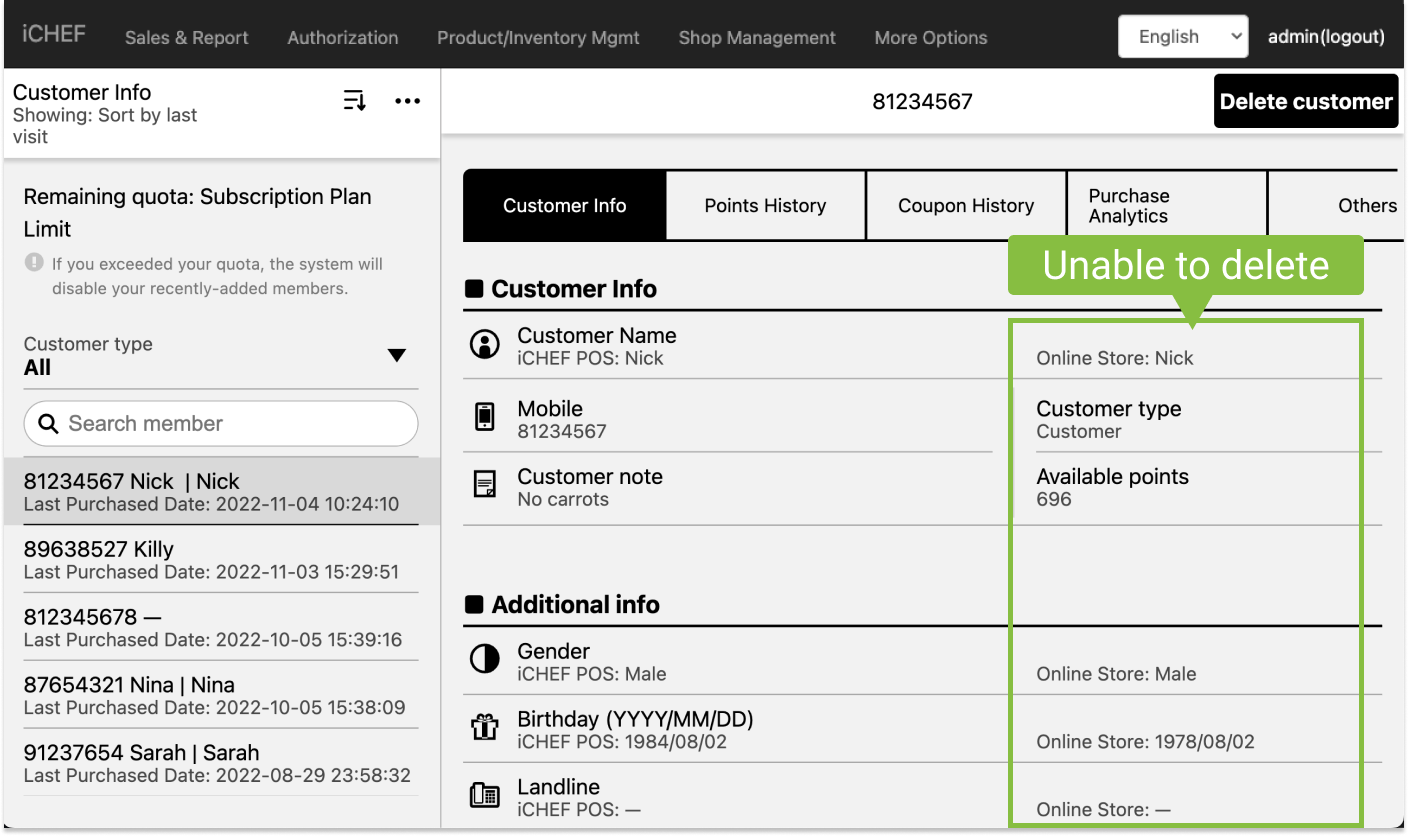 If the customer signs up as a member with the same number on the online store, you cannot delete his/her member info.