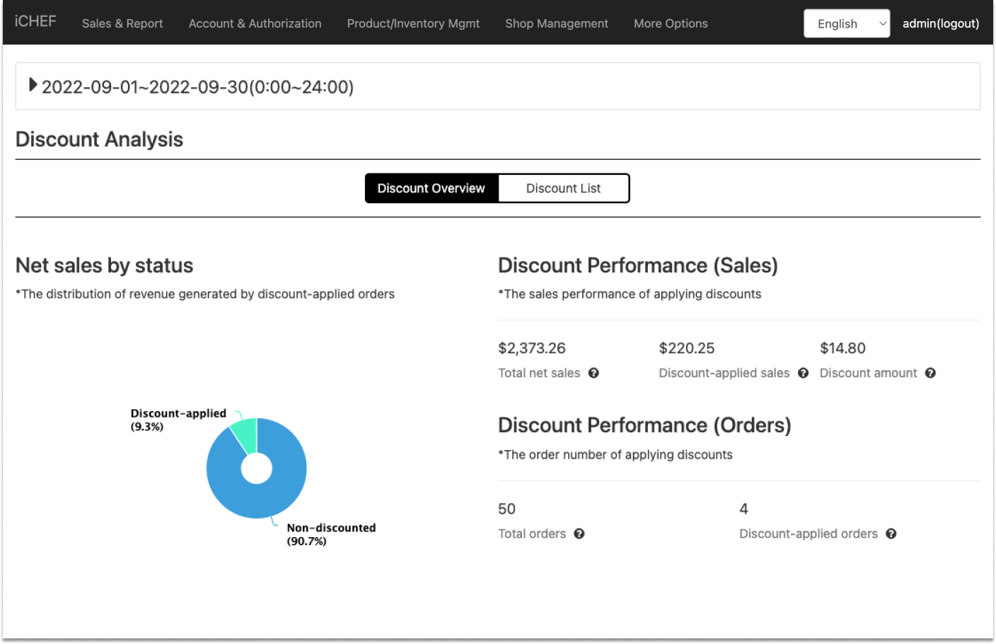 - Go to Sales & Report > Discount Analysis > Discount Overview or Sales & Report > Sales Analysis > Discount Overview