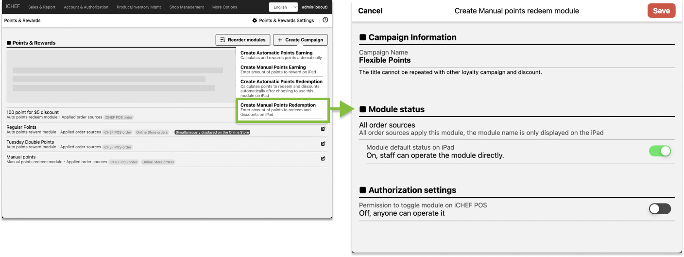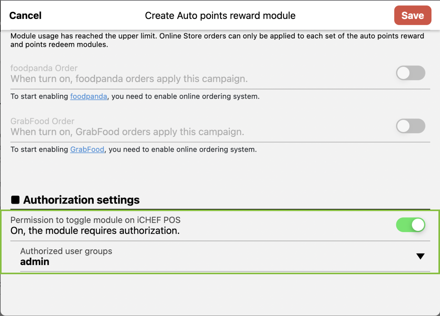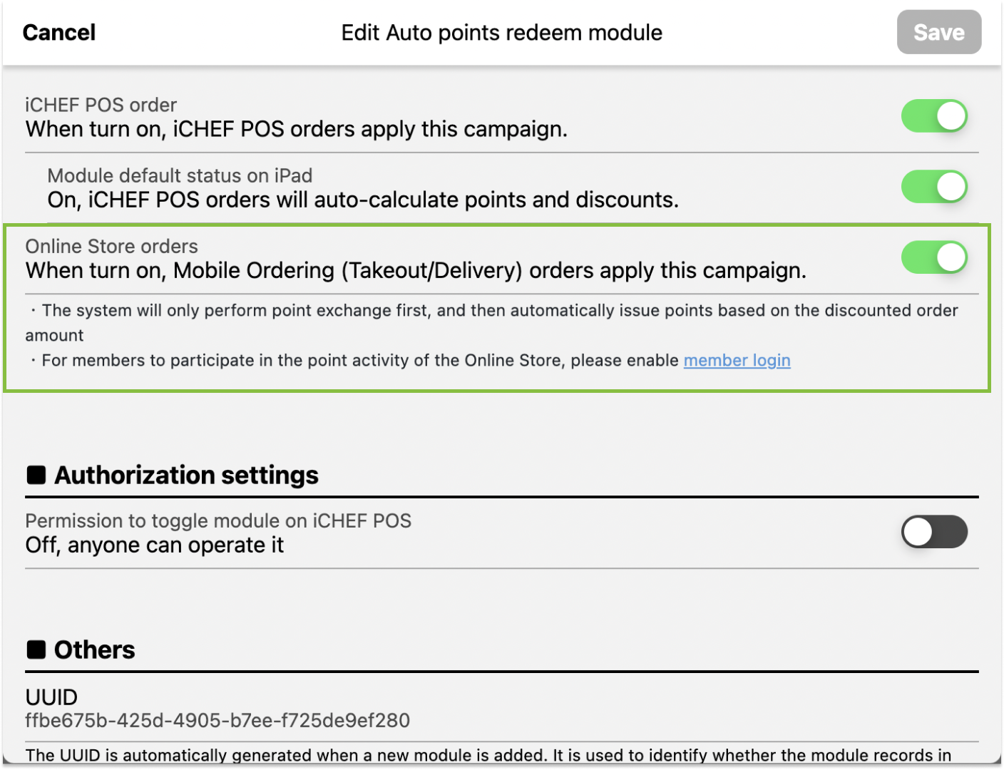 You can apply points program to different order sources, such as iCHEF POS, Online Store.