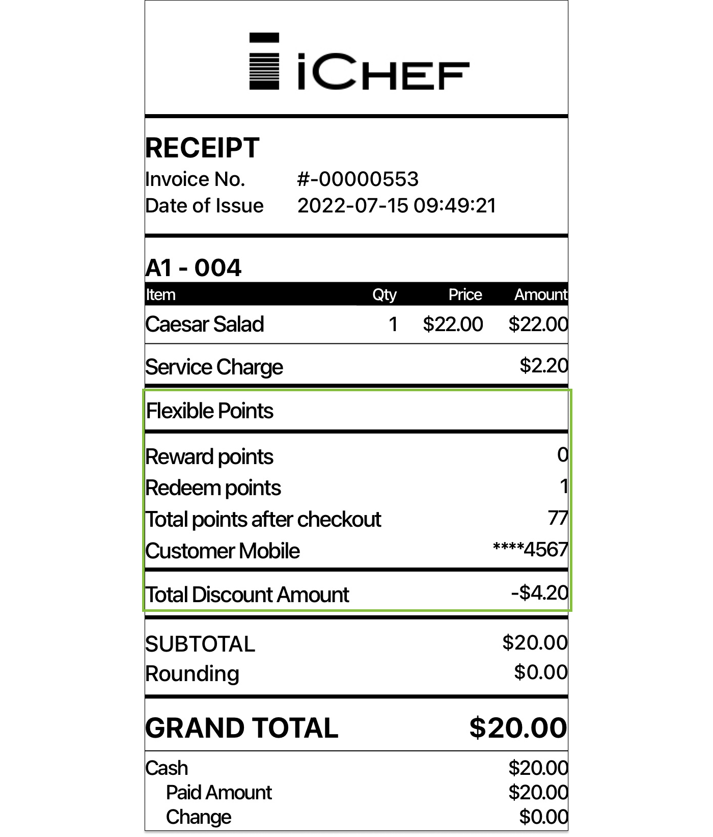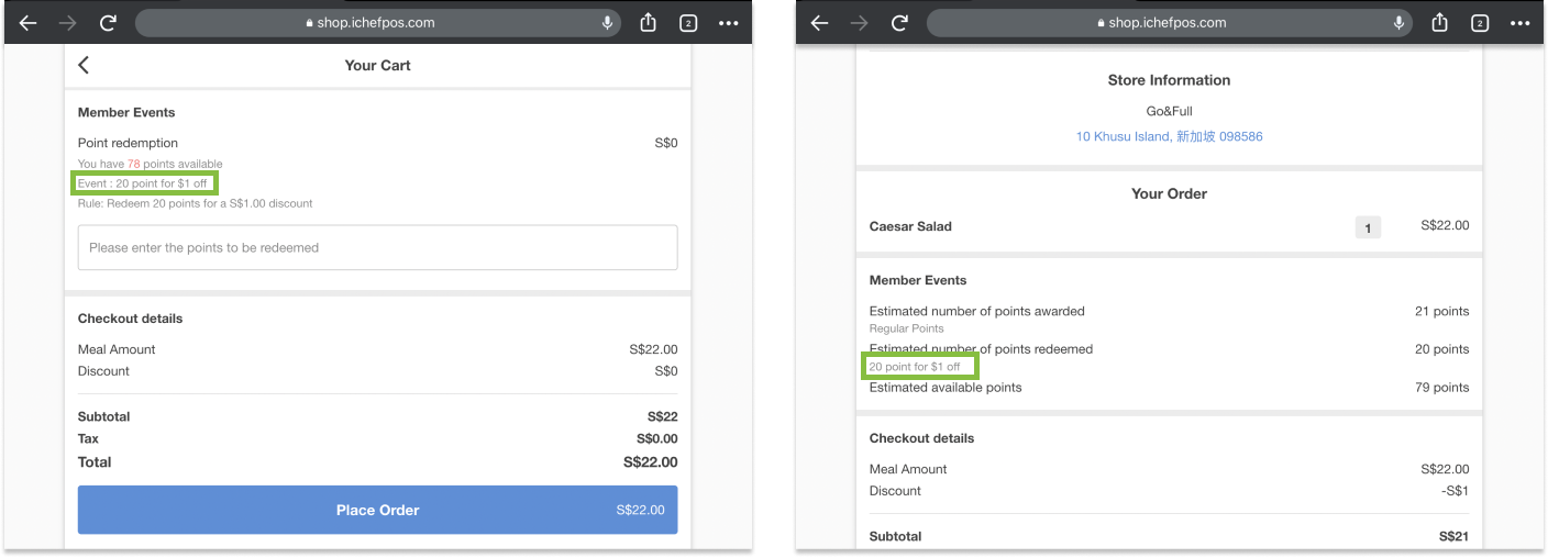 Every 20 point redeemed, the customer can get $1 discount. See how the points being redeemed: