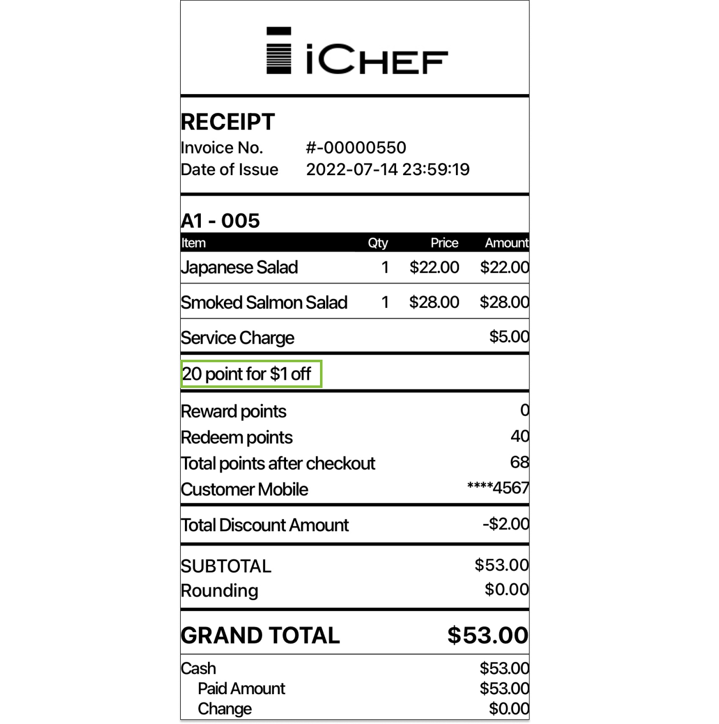 At checkout, you can search membership by phone number, and redeem points on iCHEF POS to offer customers discounts.