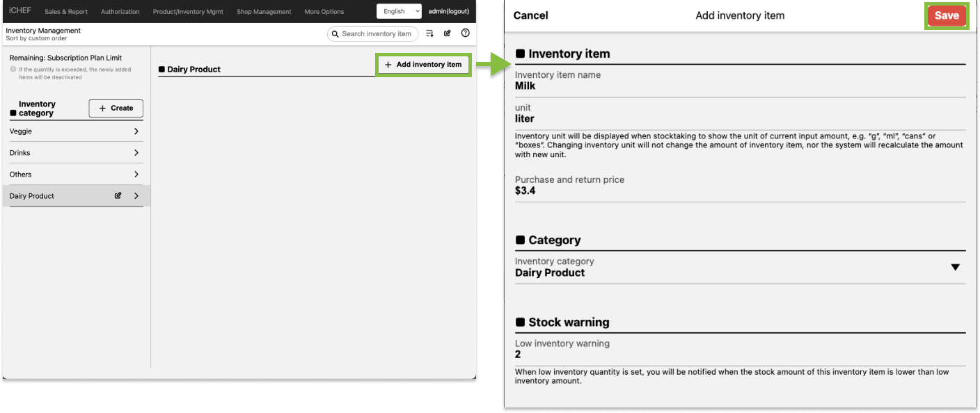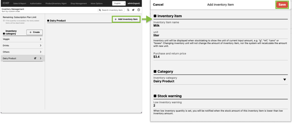 - Fill out item information and click [Save] to complete