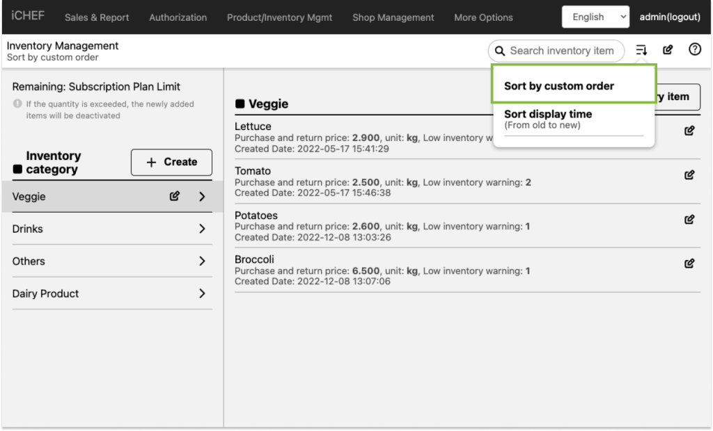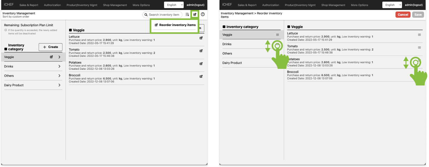 Change the listing order of inventory categories and items in iCHEF POS app.