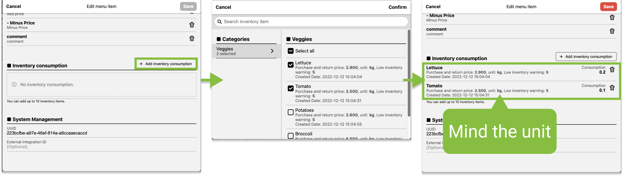 - Select the ingredient and enter the consumption