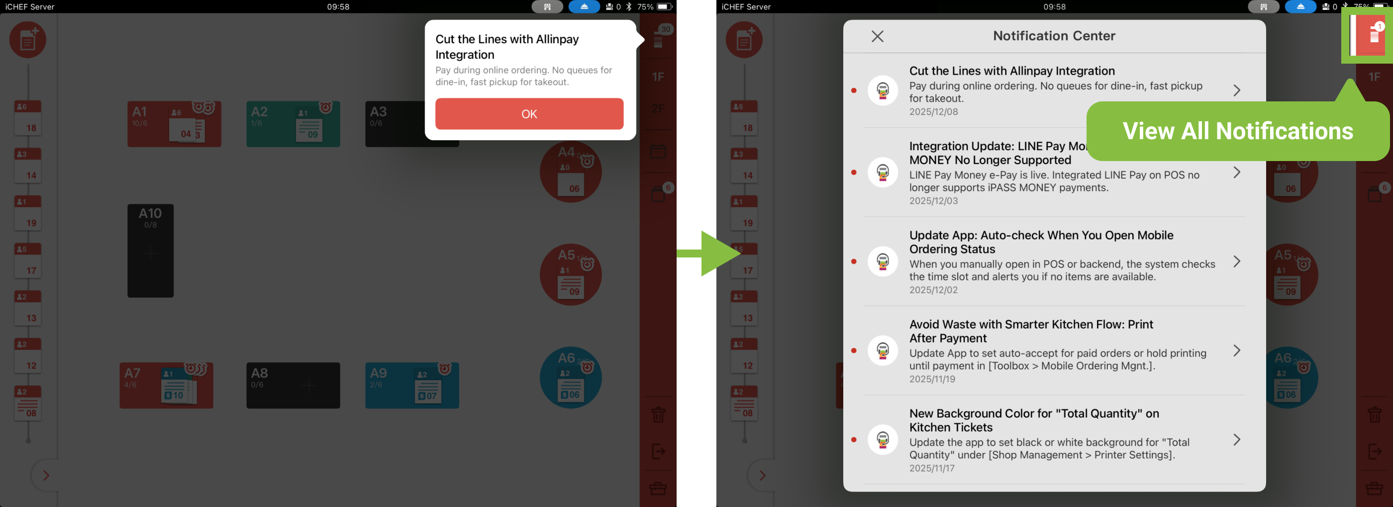iCHEF will display notifications about the latest POS features and optimizations when you log in to the POS! You can also access the Notification Center anytime via the Logo icon in the top-right corner. Once inside, you can see all past notifications and detailed descriptions.