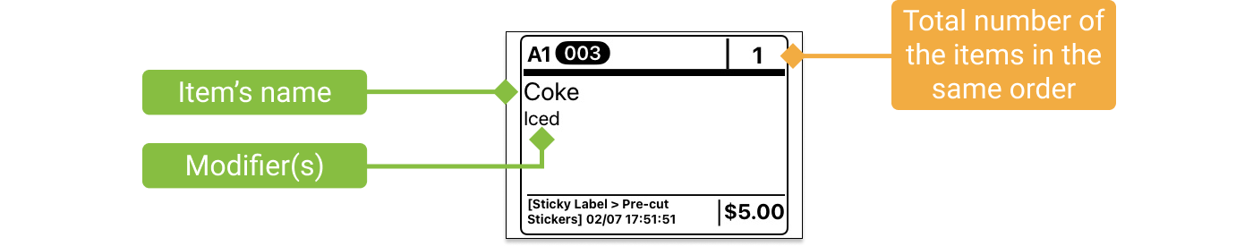 It can be plastered on the containers used in your store (e.g. bowls and cups) for the kitchen staff to pack the items correctly. This label will fully display all of the selected items and modifiers and print each meal separately.