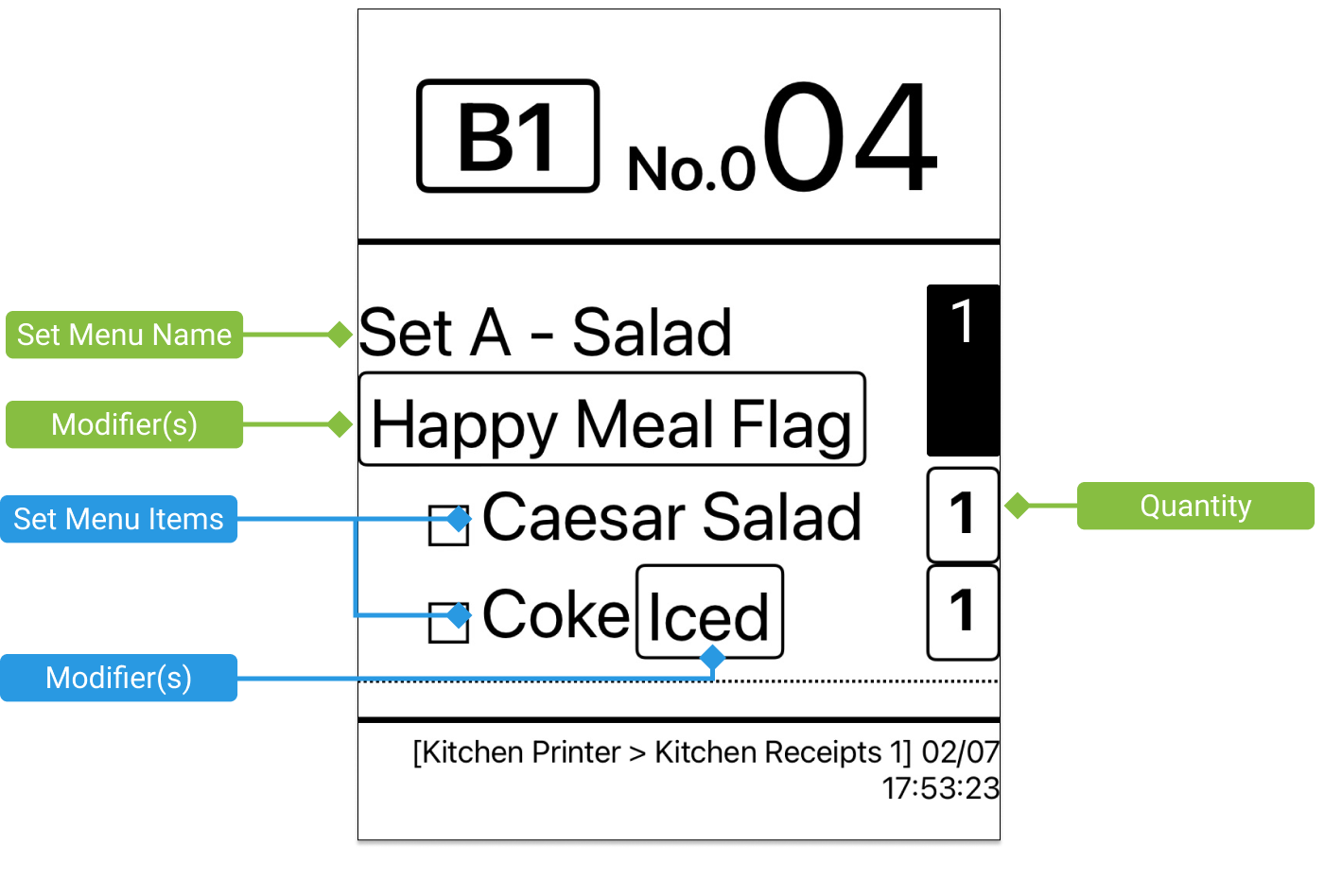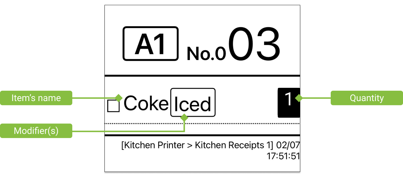 After submitting an order to the kitchen, the printers will print out different tickets according to your printer settings.