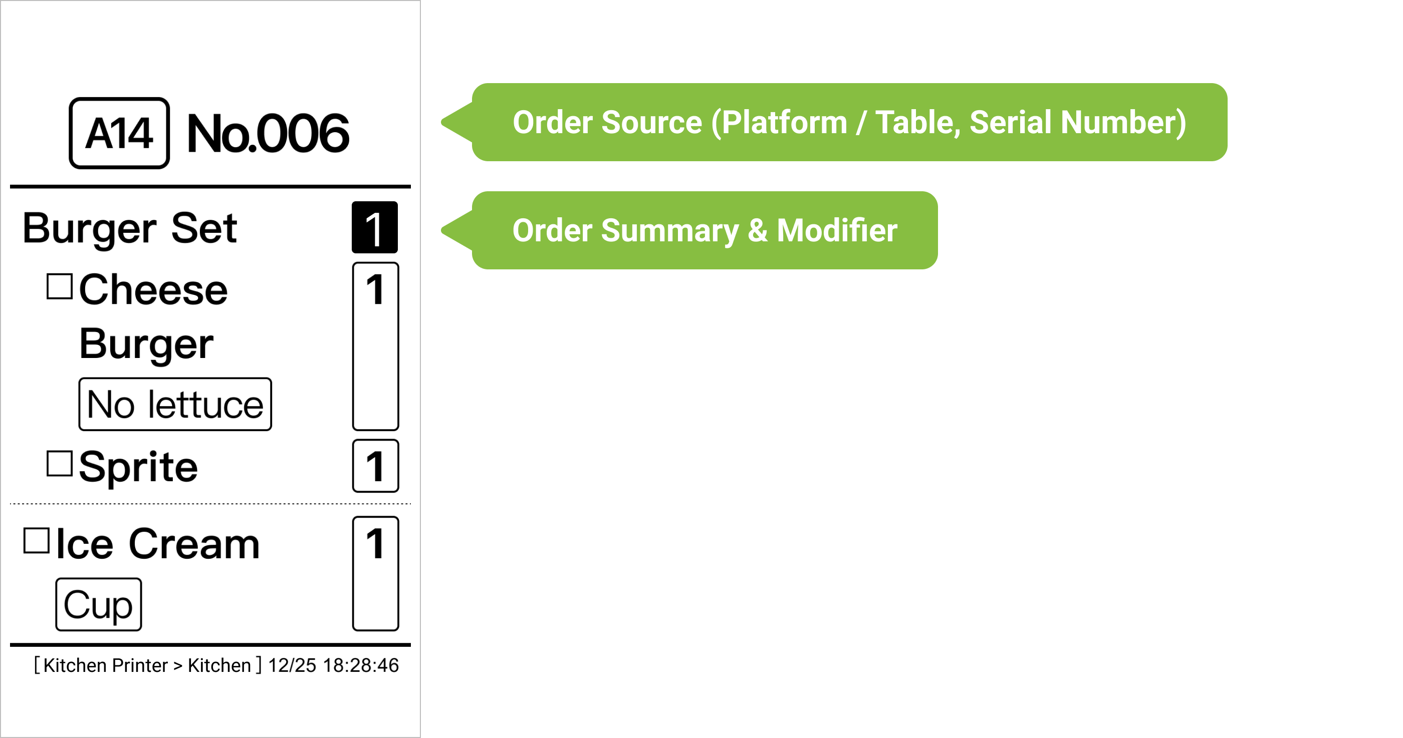 - One Item per Ticket: Print each item separately for the kitchen to prepare and check them one by one.
