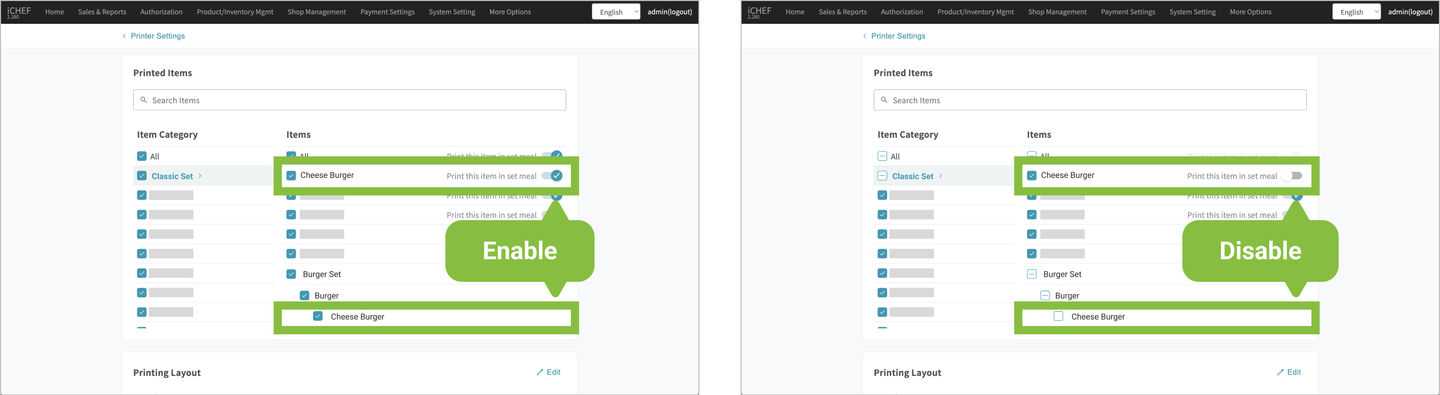 - Disabled: This item will be printed on the orders only when it is ordered as a menu item. When it is included in a set menu, the system will deselect it automatically.