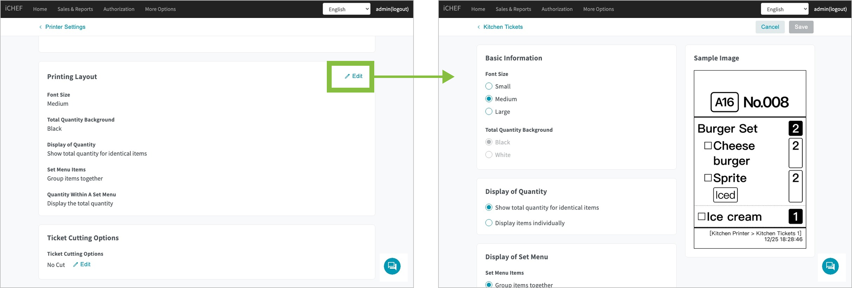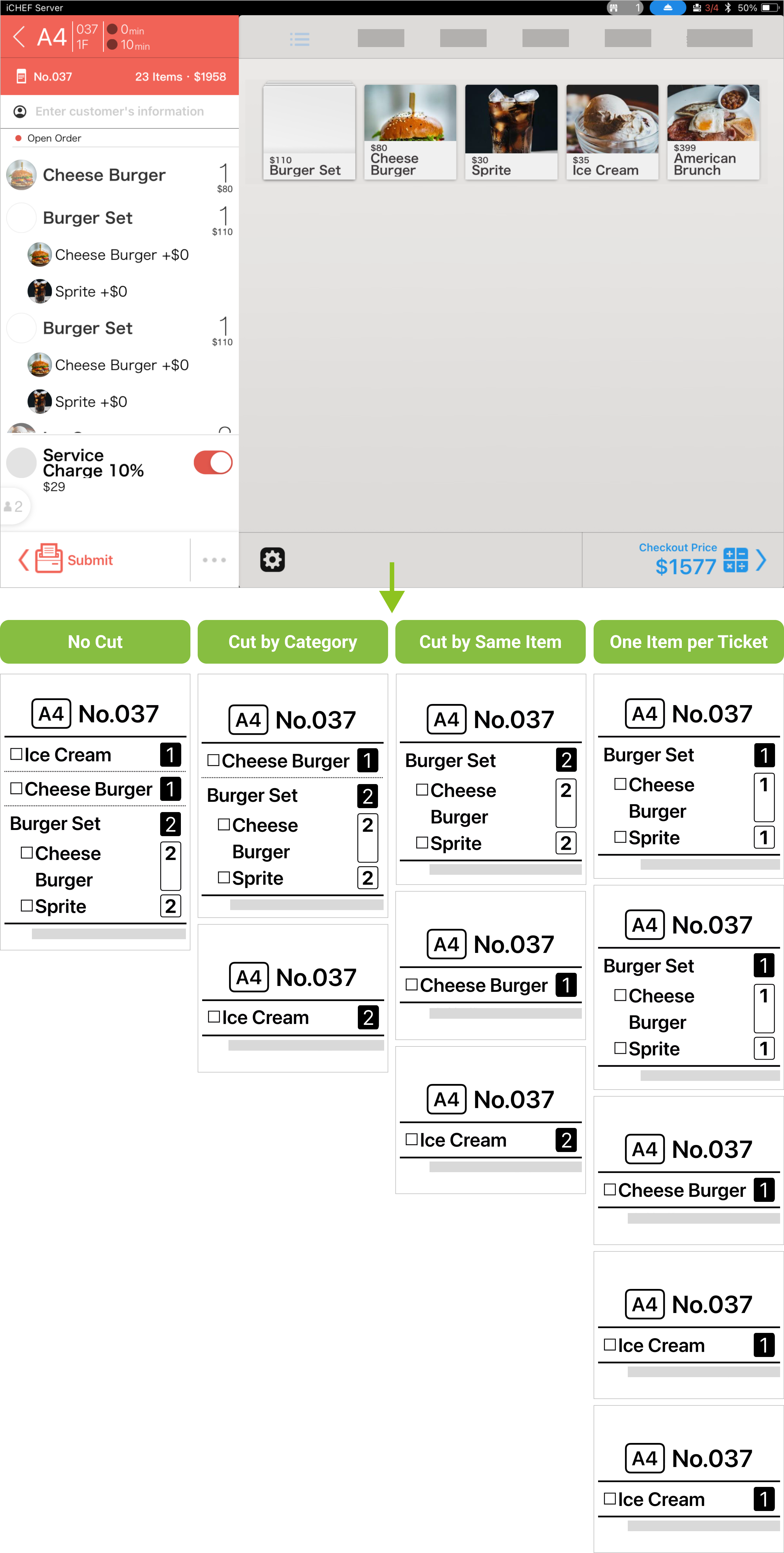 - Cut by Same Item: Print the same items on one ticket for the kitchen to prepare them altogether.