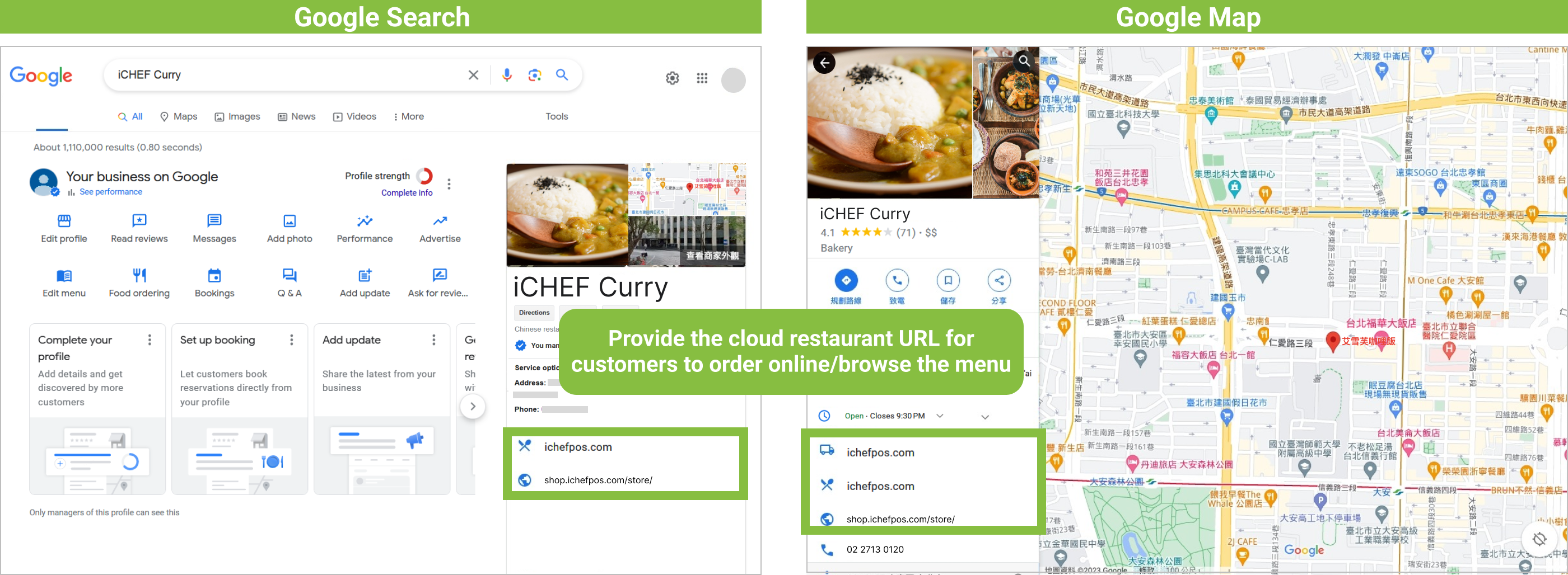 Customers usually choose a restaurant based on the business information and menu photos. If you are using iCHEF Online Store, you can include the link in your business profile for customers to place orders or view menus more conveniently.