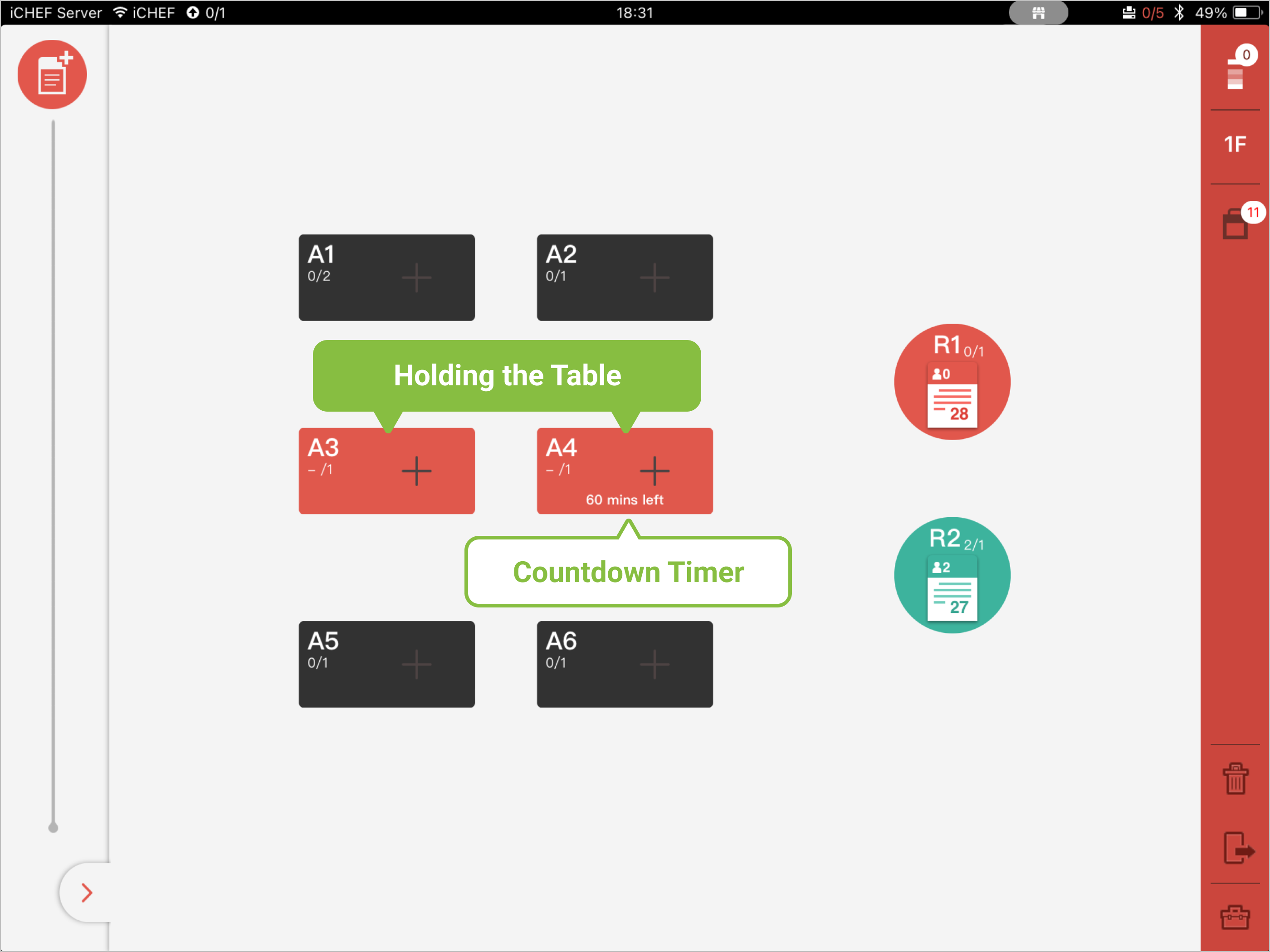If you need to reserve specific tables during operation, you can hold the table in iCHEF POS app. Simply long-press on the table, select the duration, and it will be marked and start counting down automatically! This makes it easy for employees to identify tables when seating guests.