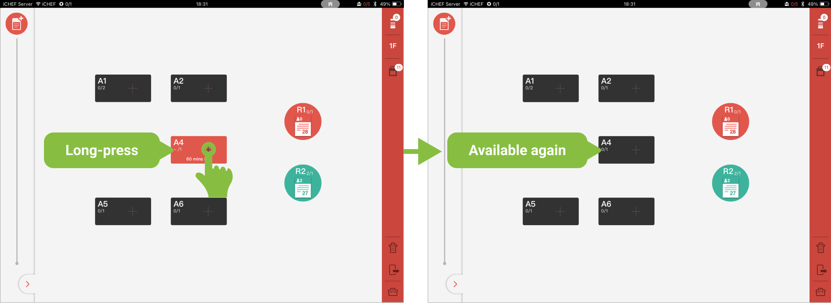 - Hold for 60-240 minutes: The table will be released when the time’s up or long-press the table again to release.