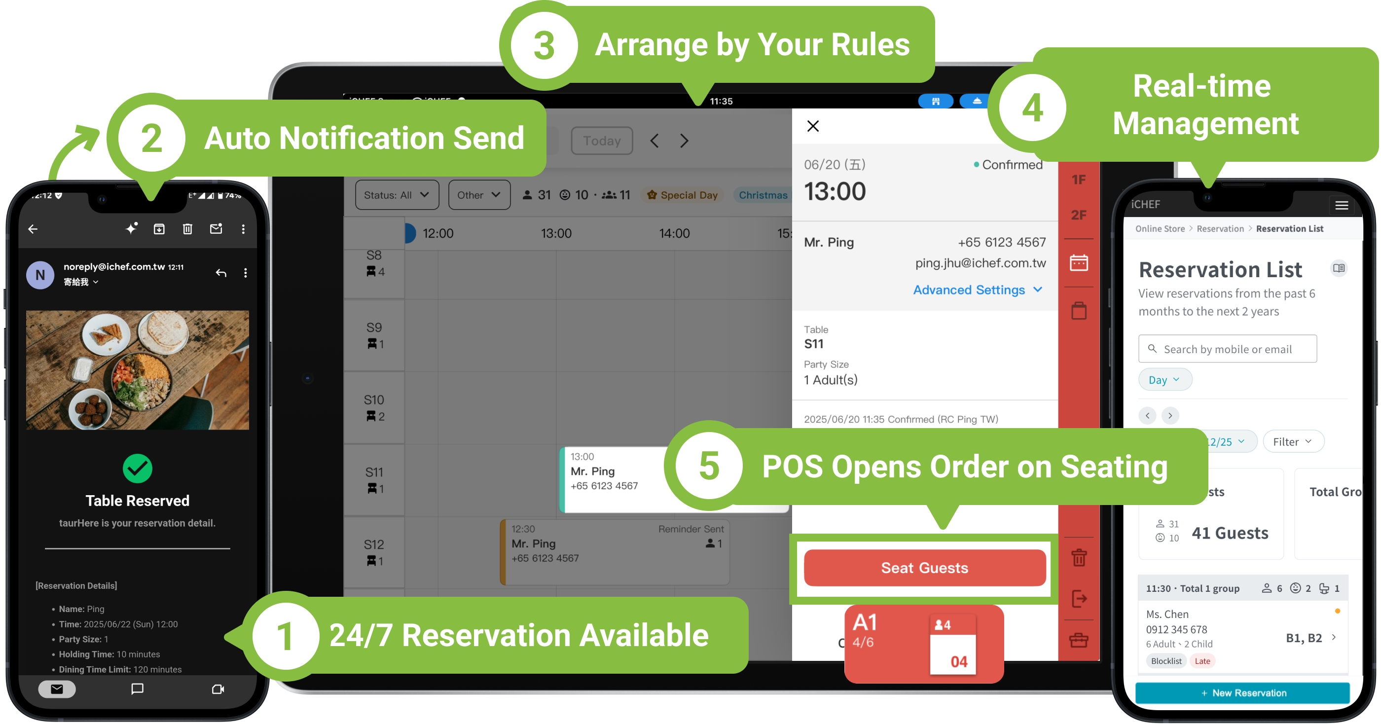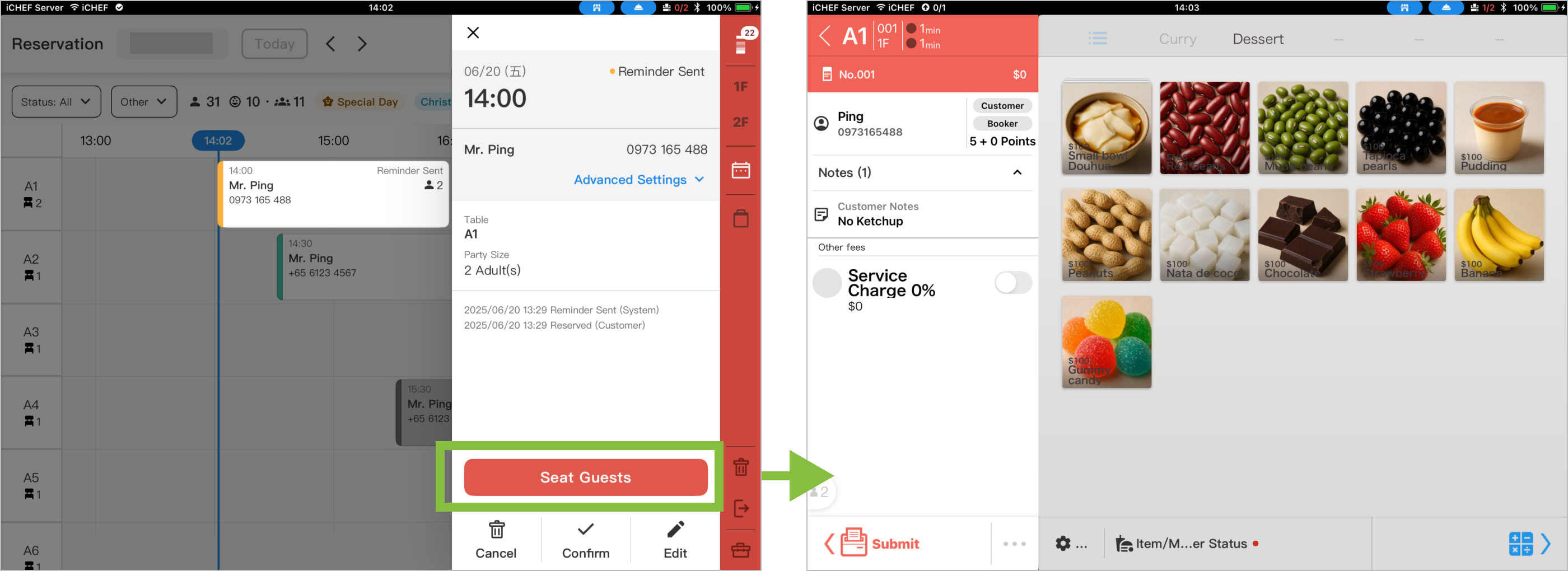 [Reservation Management] is a native iCHEF feature. In the iCHEF POS App, you can use the [Create Order Upon Seating] button to have the system automatically create an order for the reserved table, importing reservation details and integrating them with your membership data, making membership management easier for your restaurant!