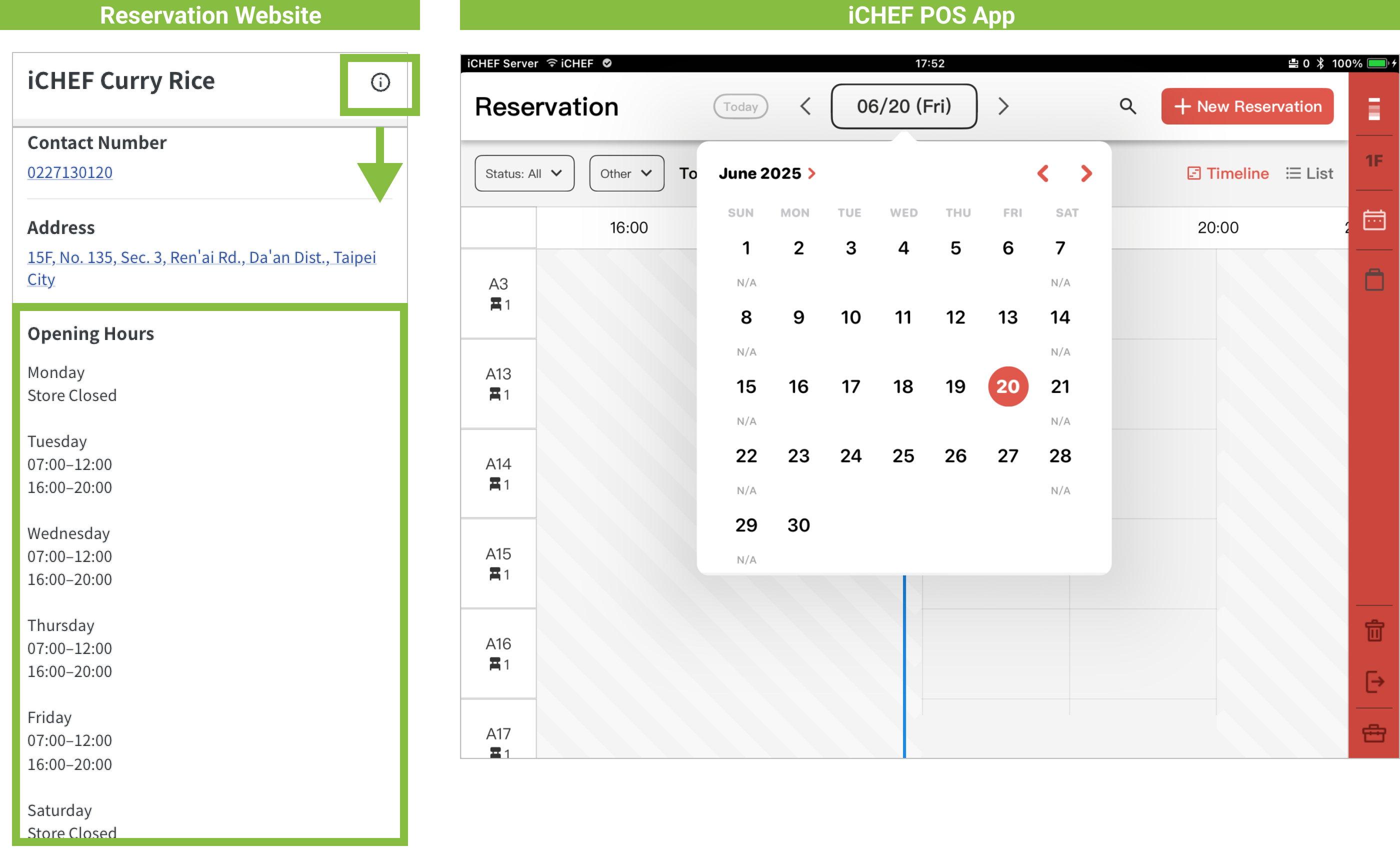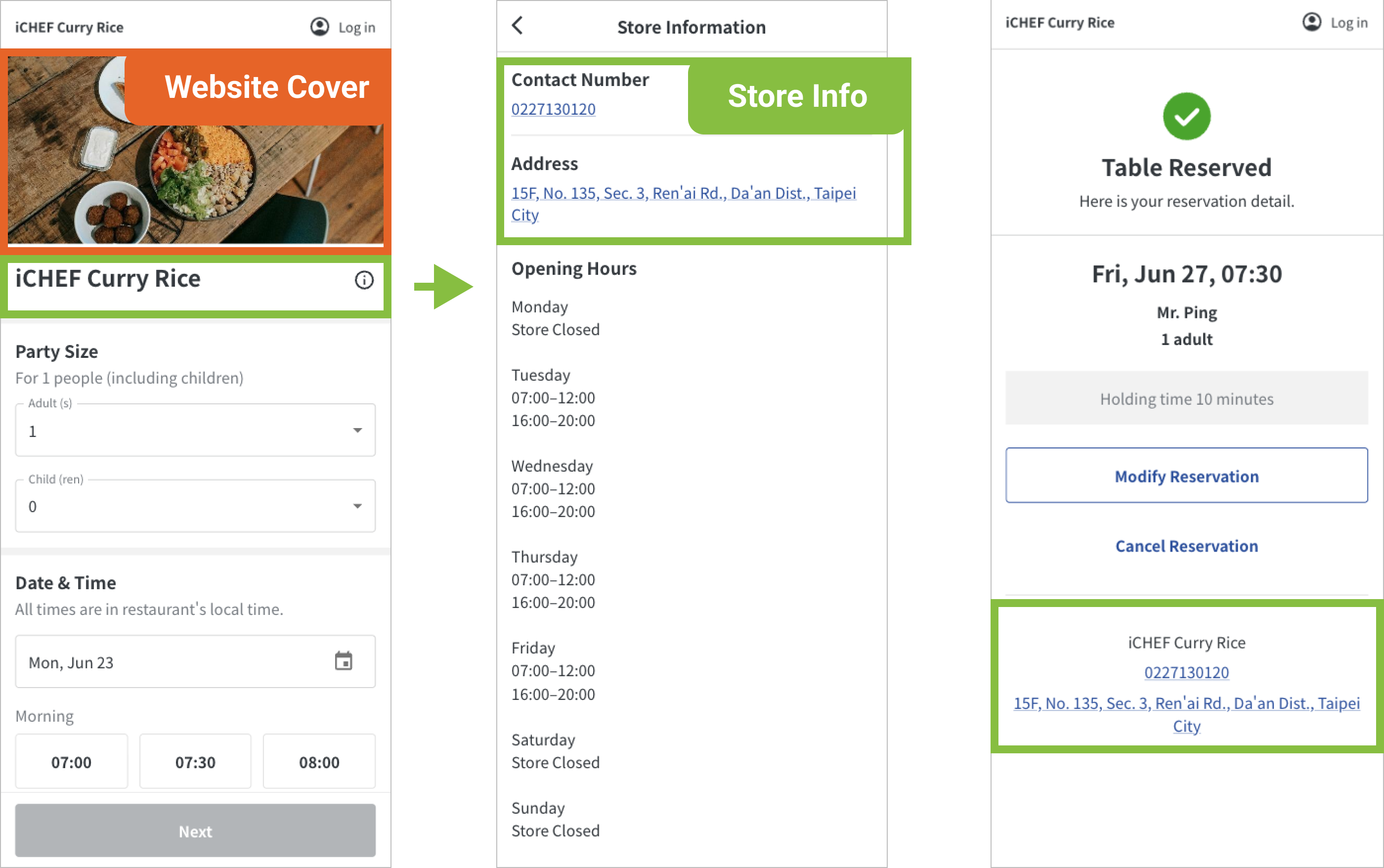 Display your store information on the reservation website for the customers to view. Just set up and save the store information in the backend, and the homepage, store information and reservation details of your website will be updated in real time.