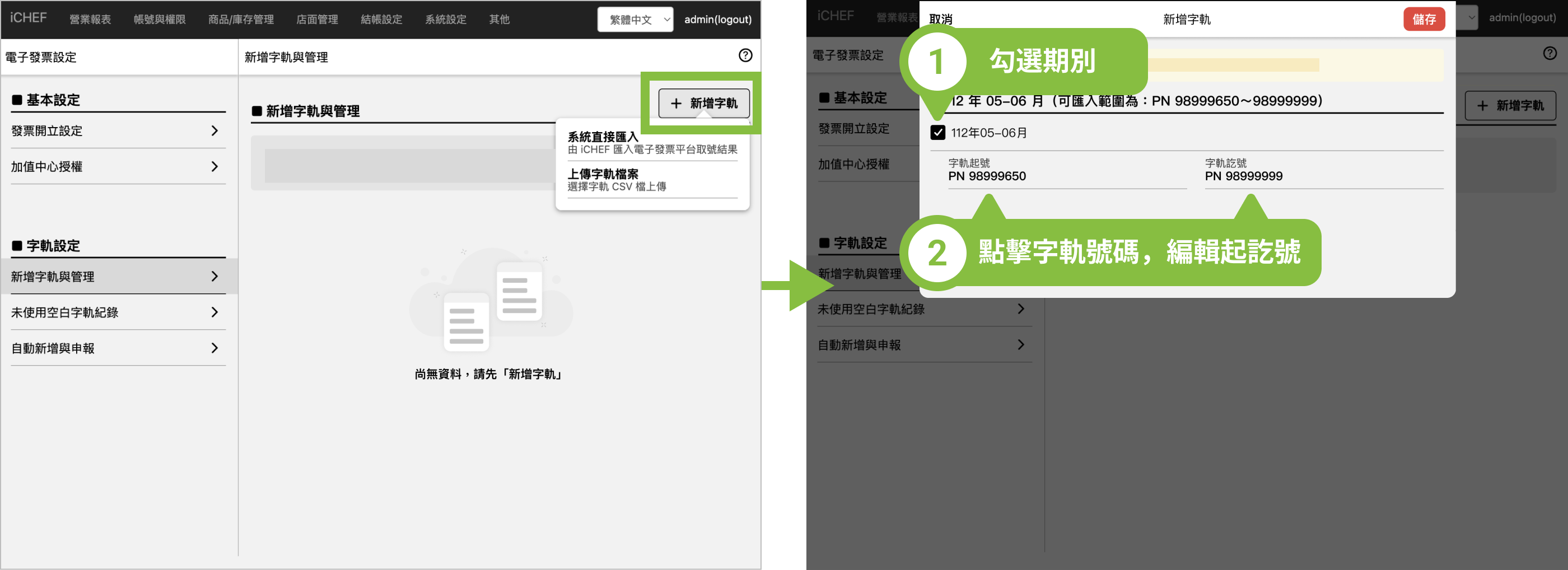 調整方式為字軌匯入後,系統會自動讀取檔案內的字軌號碼,勾選期別後,點擊字軌號碼即可編輯起訖號。