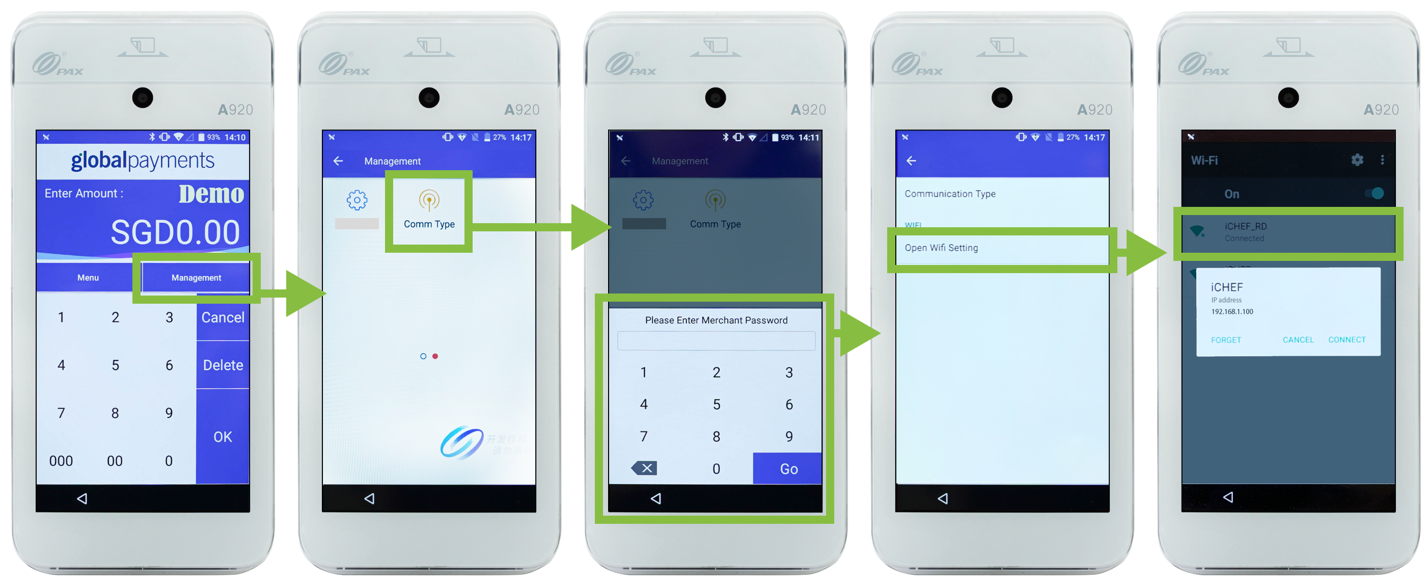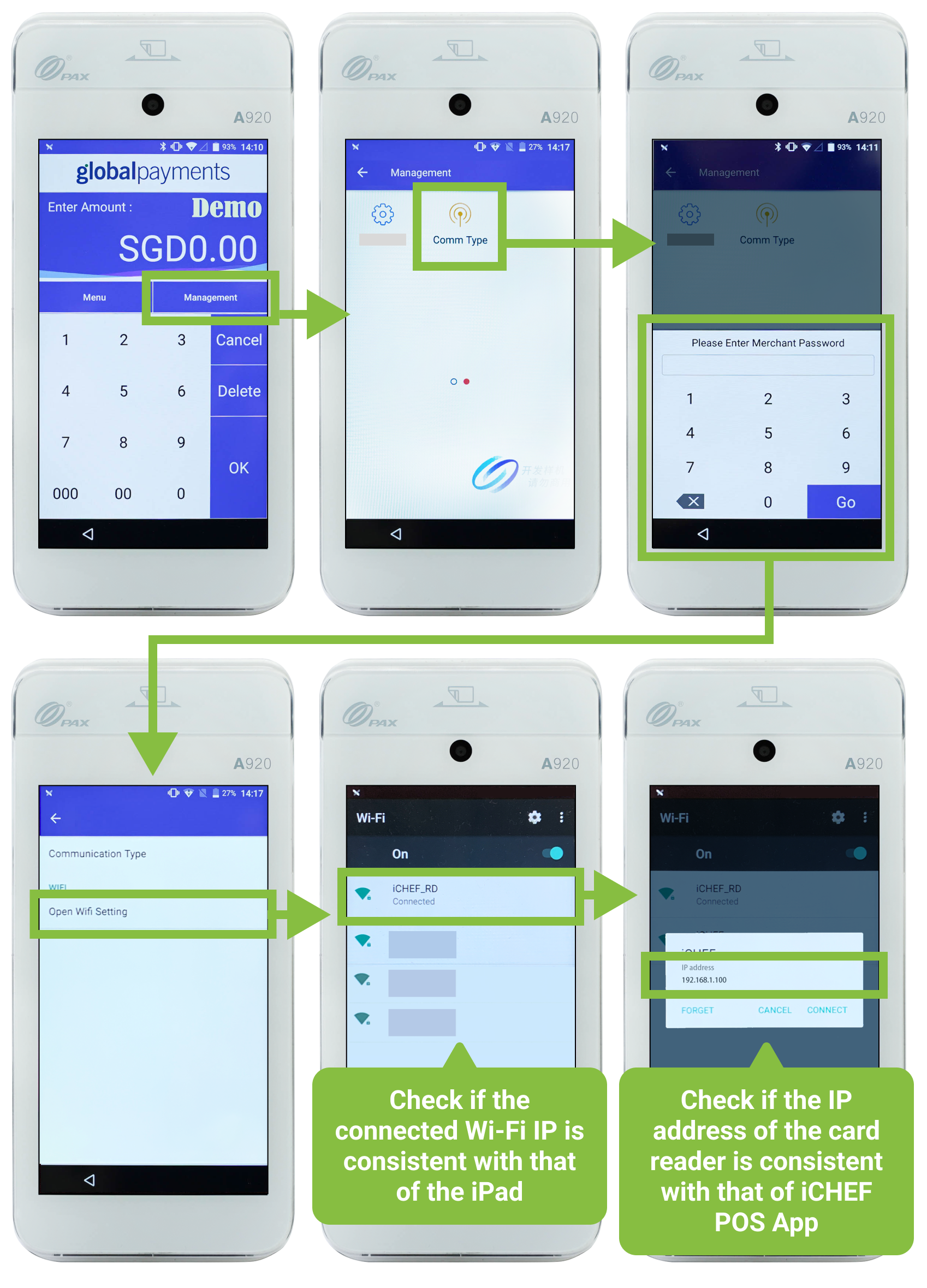 ➤ iCHEF POS App UI: [Toolbox] > [Device Management] > [mPOS Card Reader] > [Global Payments Smart Terminal]