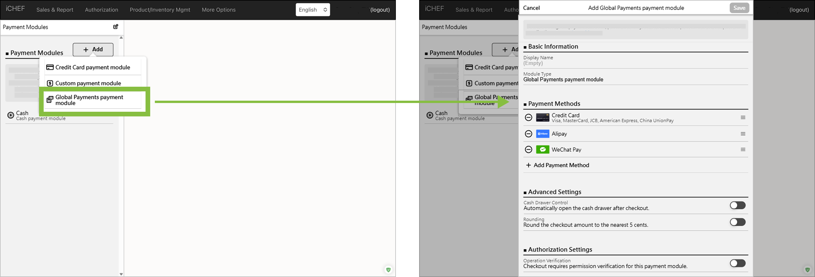 ➤ iCHEF Backend:Payment Settings > Payment Modules