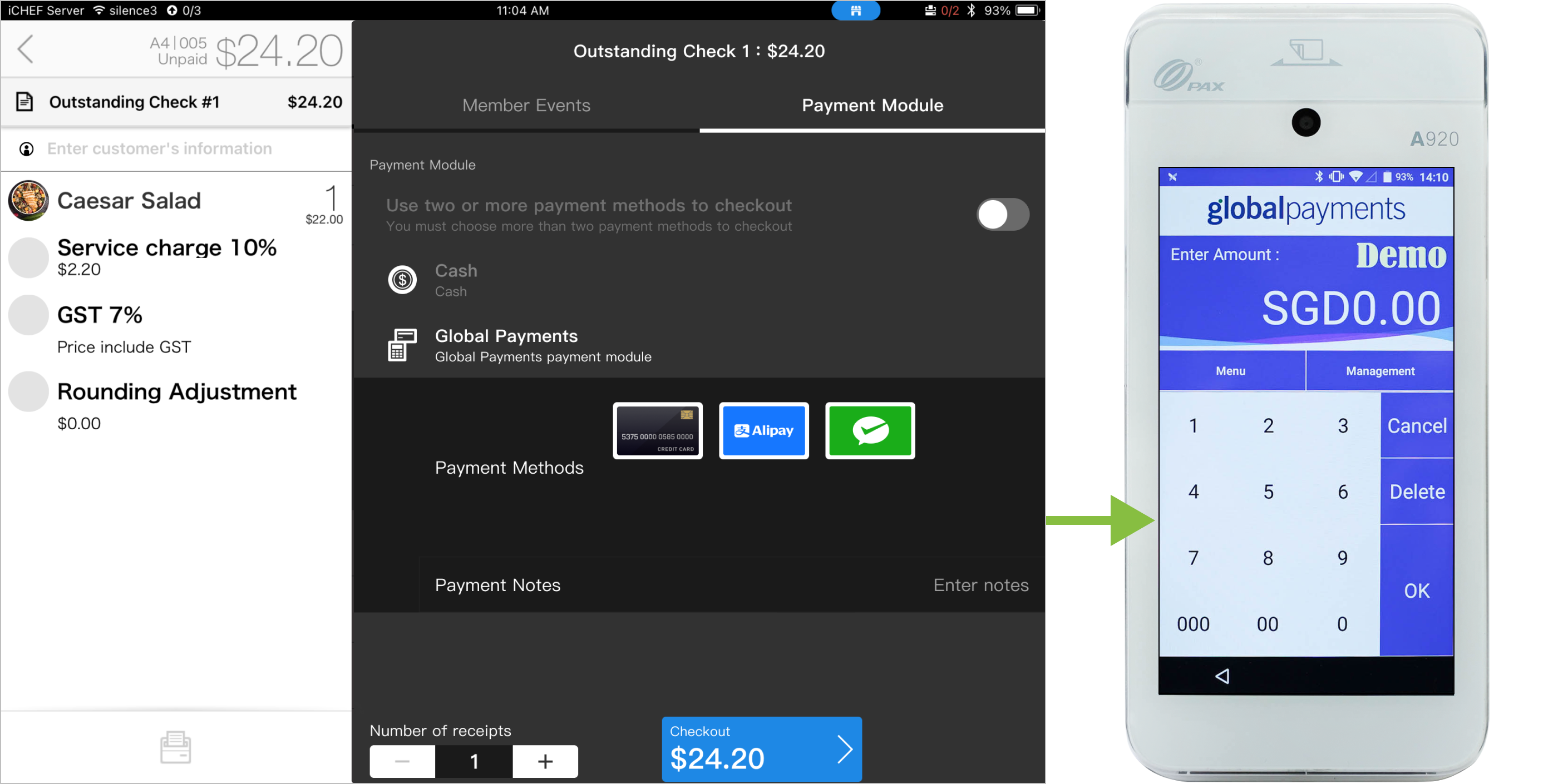 Global Payments card reader is integrated with iCHEF POS. Enabling this function, you can easily complete checkout without manually entering the amount!