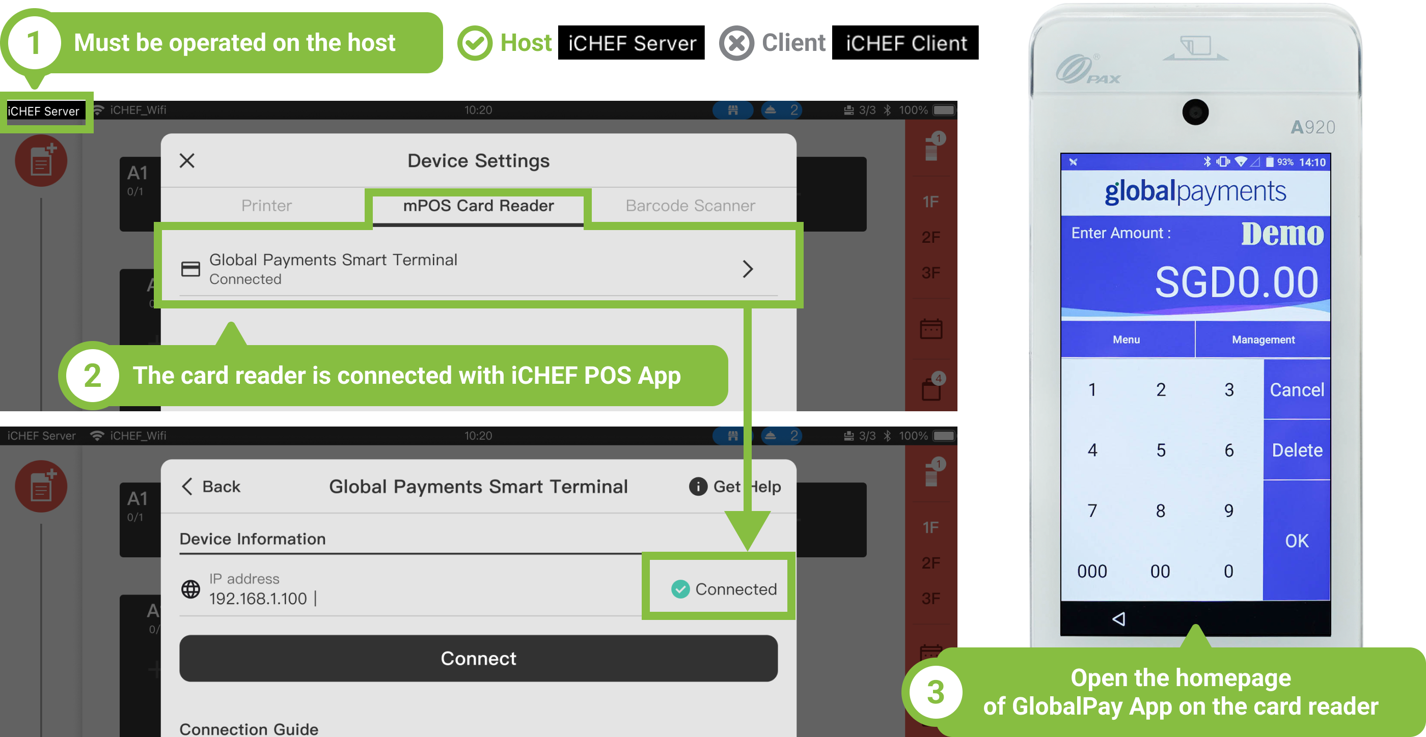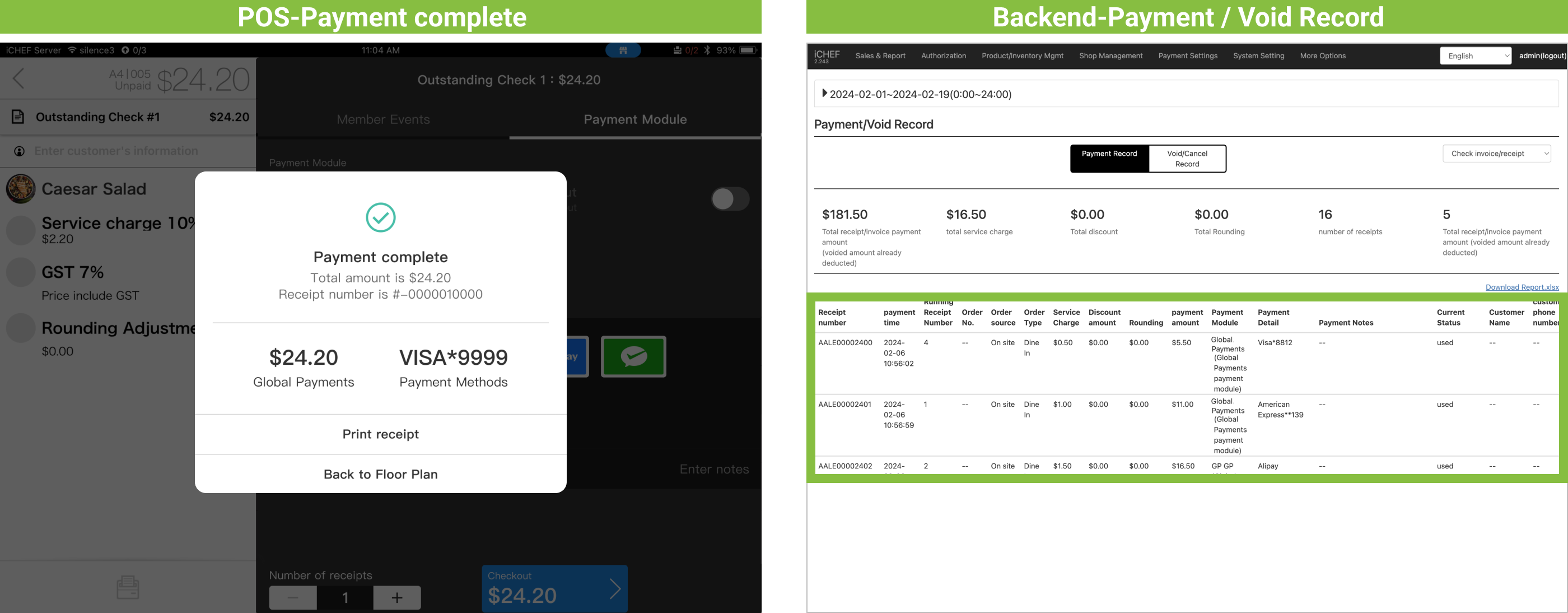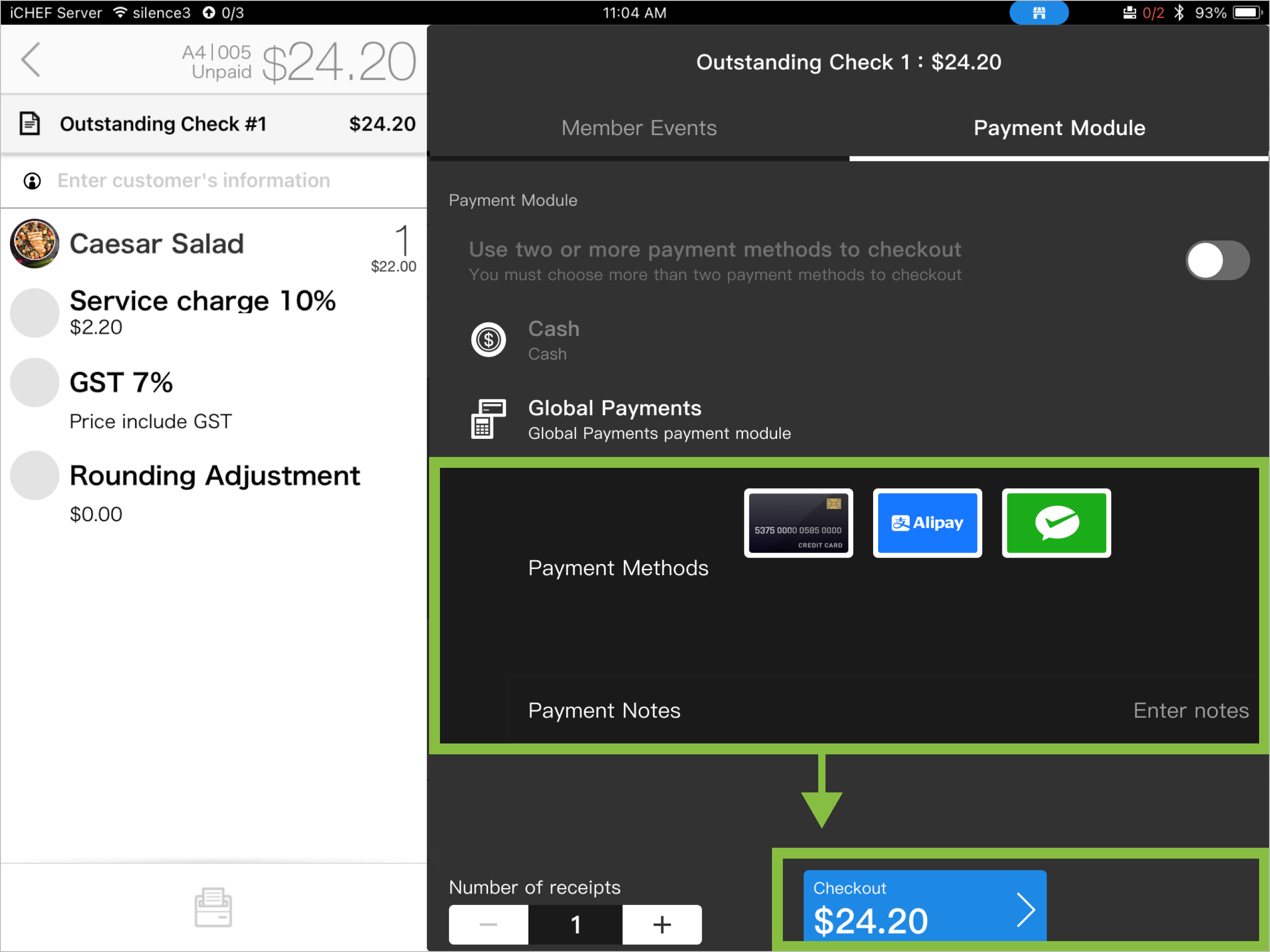 After connecting the card reader for Global Payments with iCHEF POS, you can select [Global Payments payment module] for checkout, and the card reader will enter the amount automatically and complete the process.