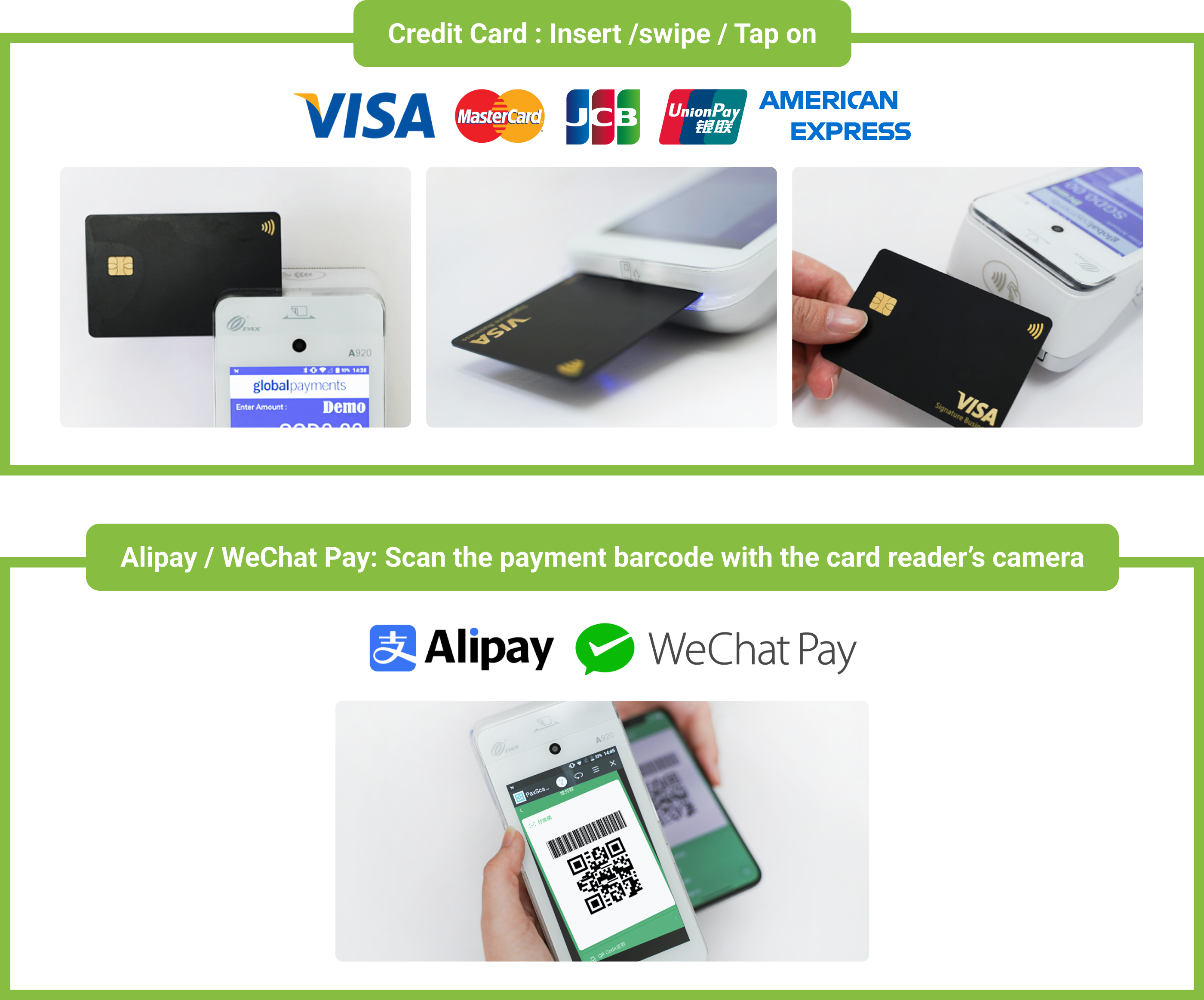 ![]() | Alipay | ✓ | ✓ | Scan the payment barcode with the card reader’s camera |