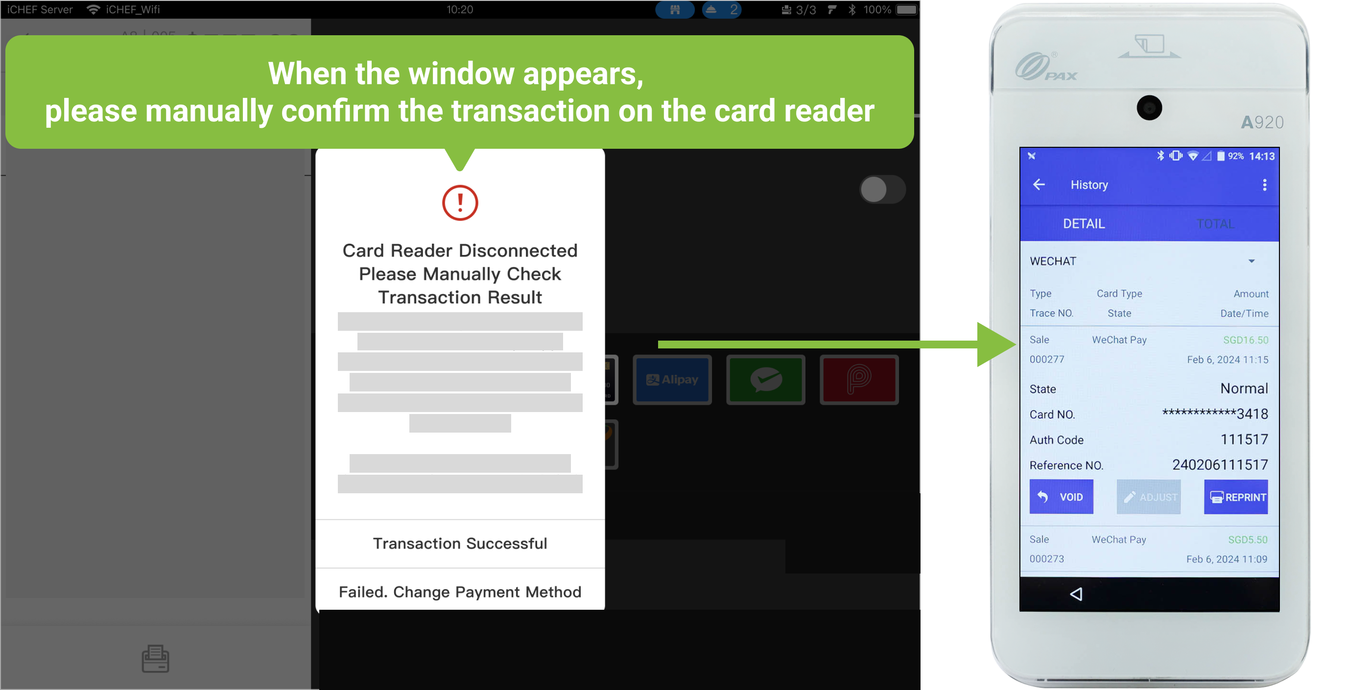 - The transaction is found: Please select [Confirm Transaction] on iCHEF POS App to complete checkout.