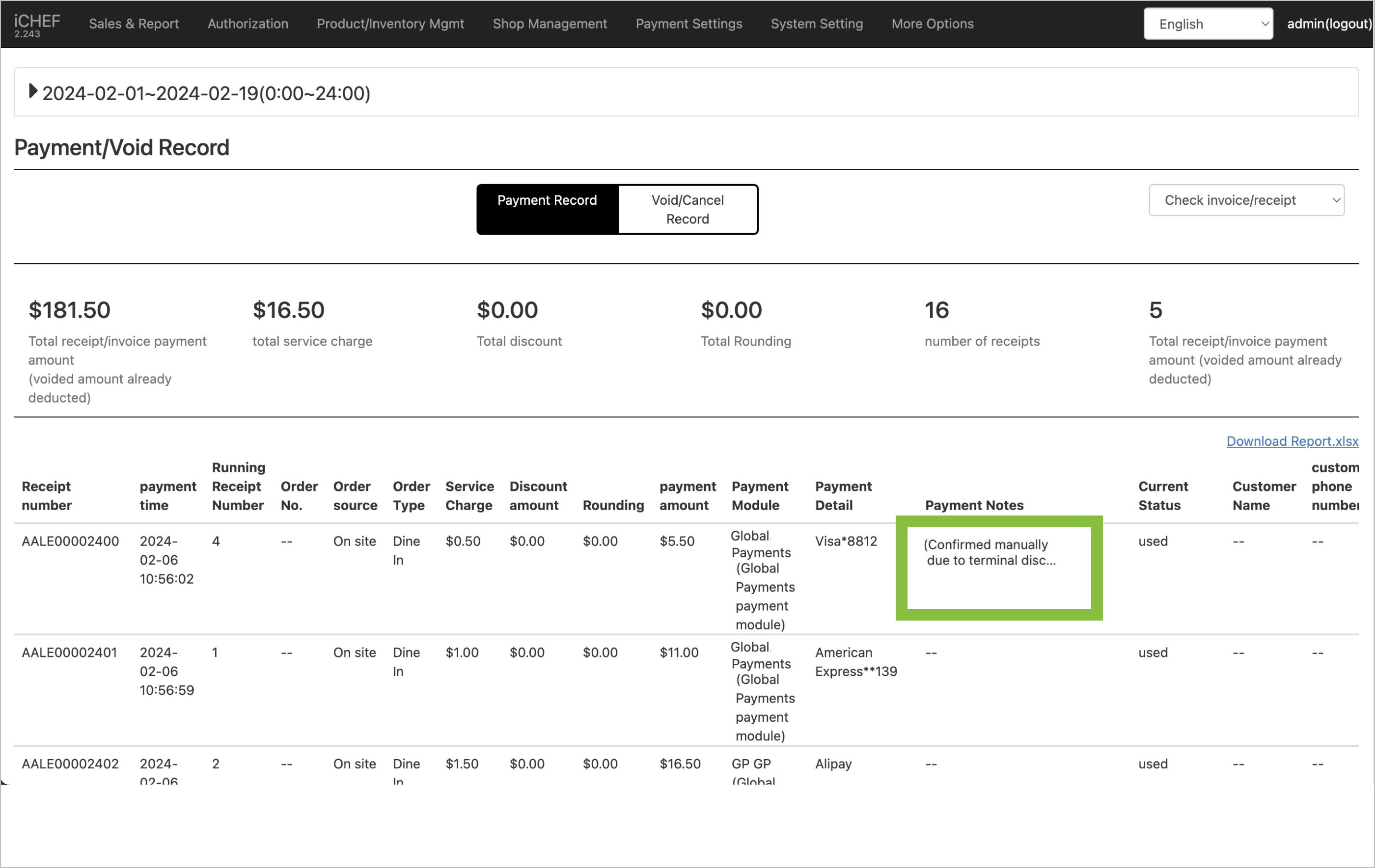 Manual refund / voiding may cause inconsistency between the payment records in iCHEF backend and that on Global Payment. Please refer to the instructions for manual refund / voiding