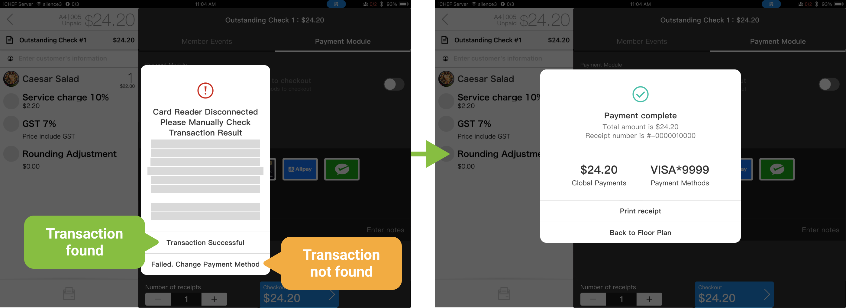 iCHEF POS can be integrated with the Global Payments Smart Terminal for checkout. However, disconnection may occur due to problems with the environment or devices, making the card reader unable to transmit the transaction result to iCHEF POS.