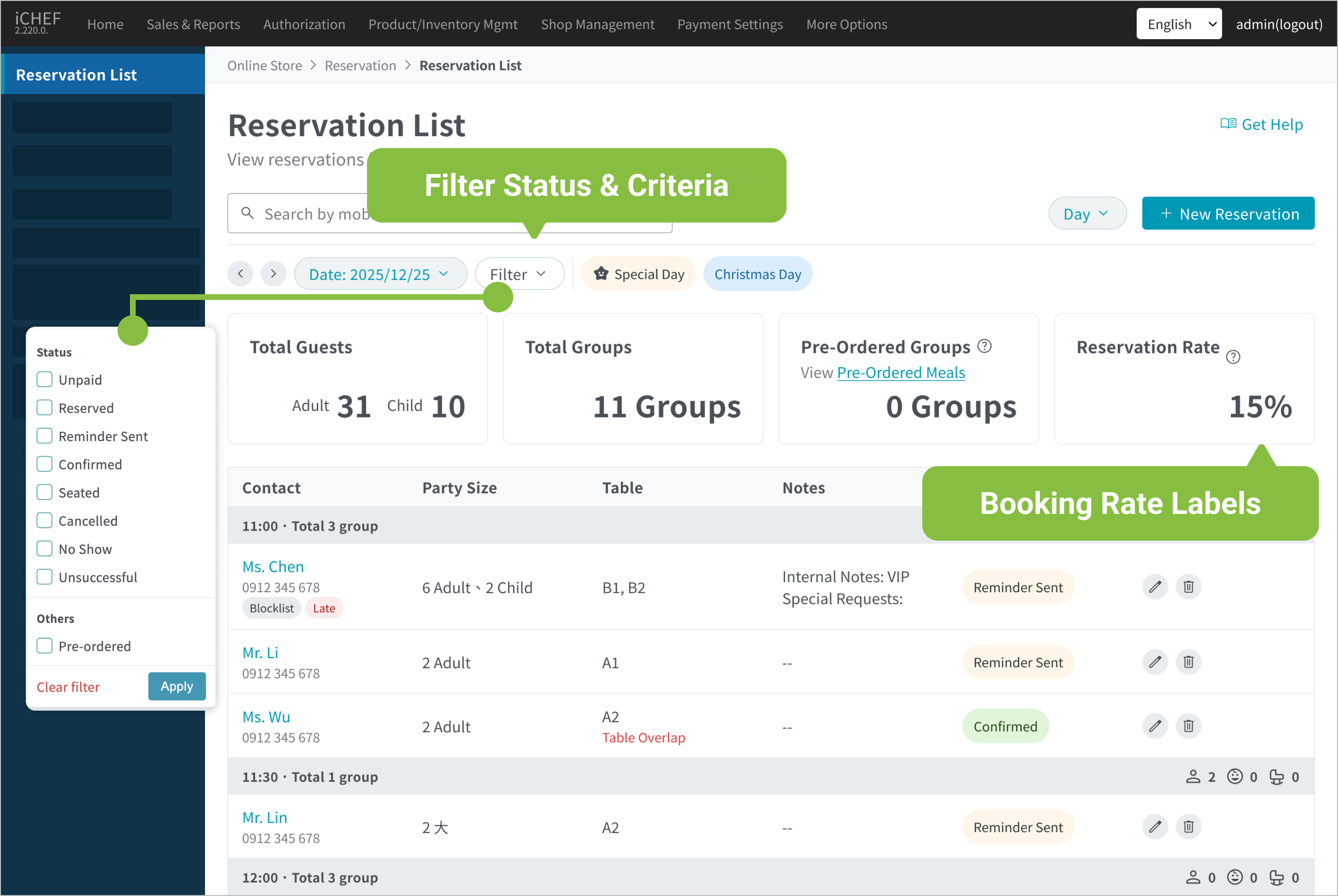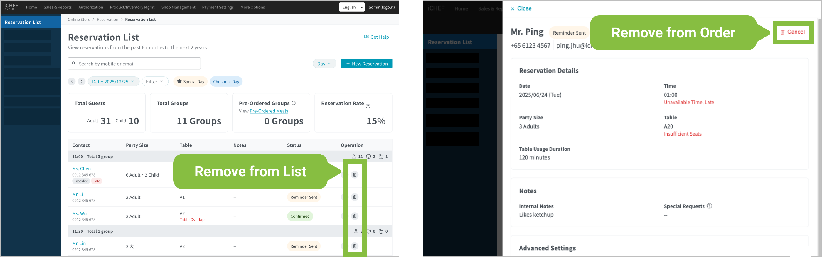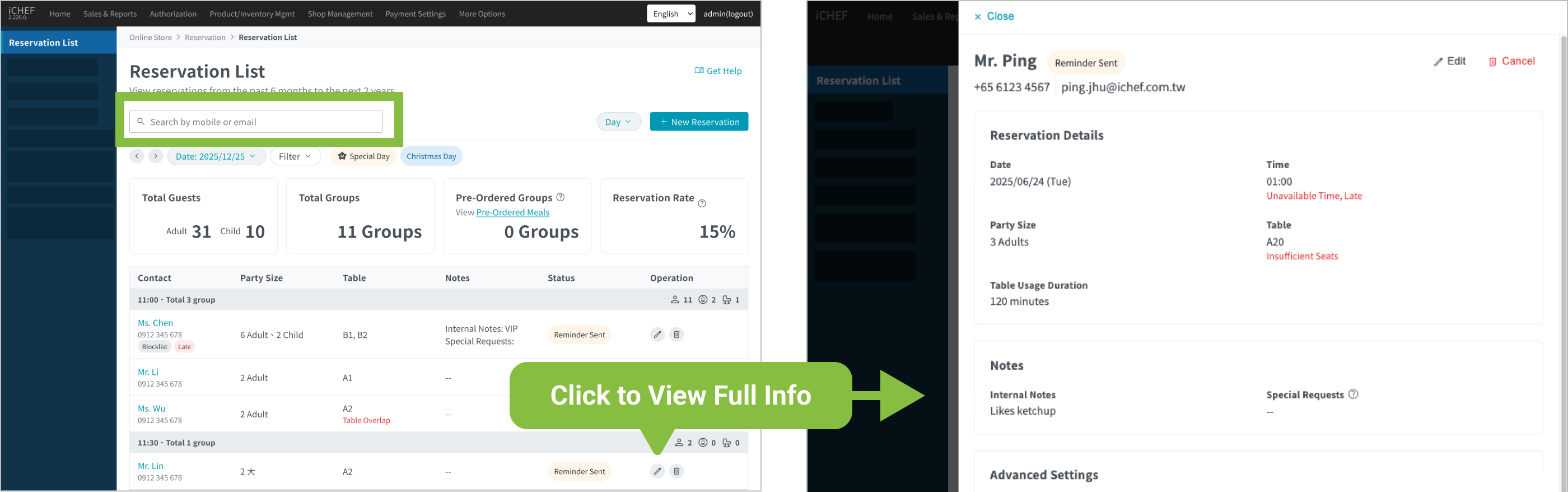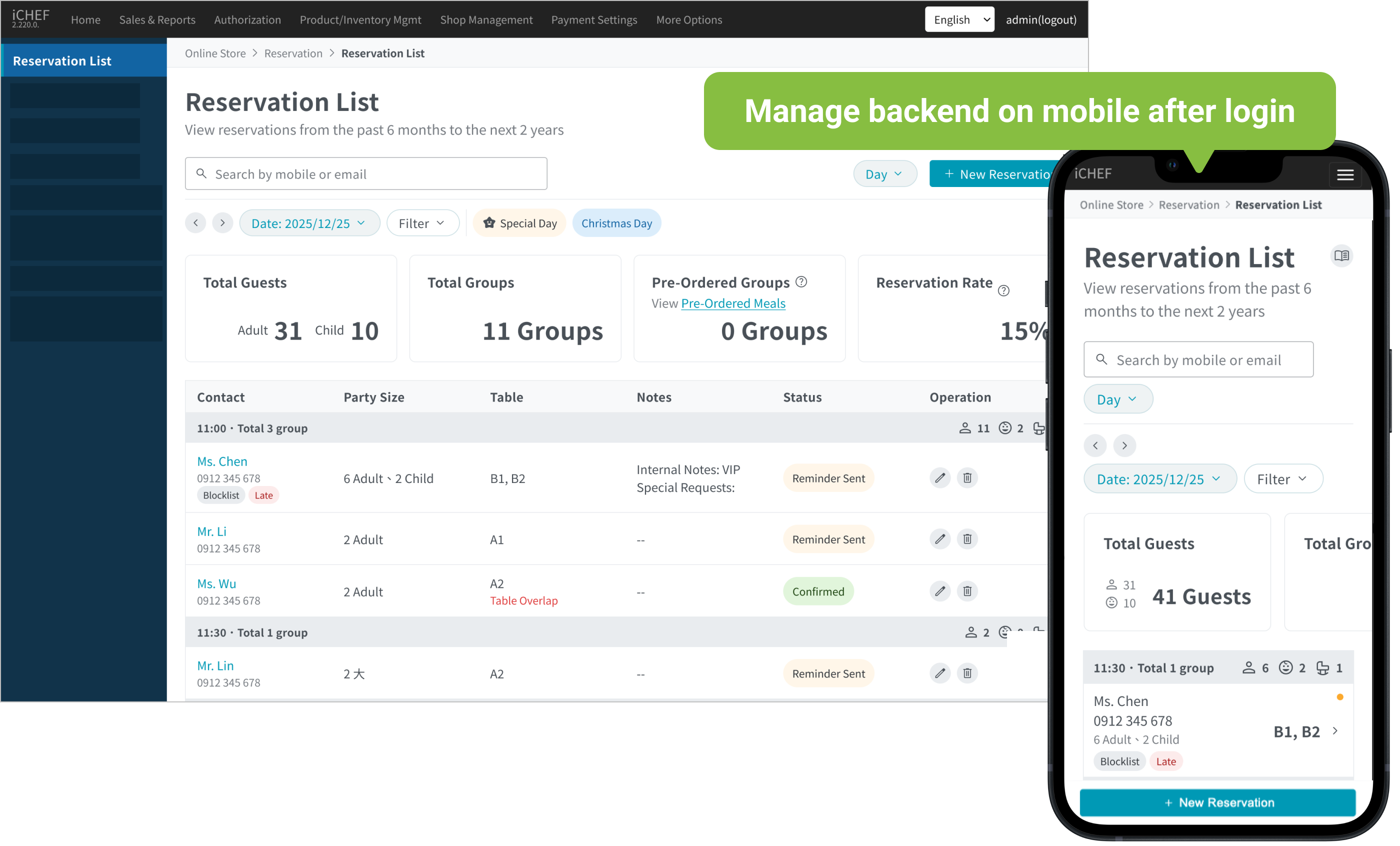 For the reservation function, you can check the real-time reservation list in the backend aside from the page for managing reservation on iCHEF POS App. In this way, whenever you receive a reservation request via social media or other channels, you can easily add or edit the reservation info with your mobile phone anywhere!