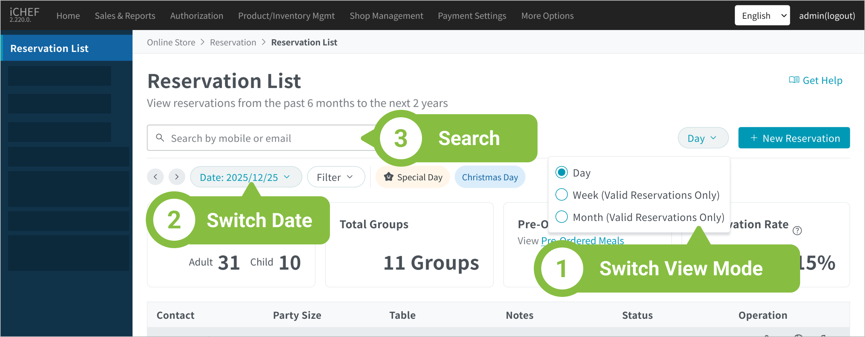 | Content | View detailed reservation info by time slot for each date. | View daily summaries of total guests and reservation counts by week. | View daily summaries of total guests and reservation counts by month. |