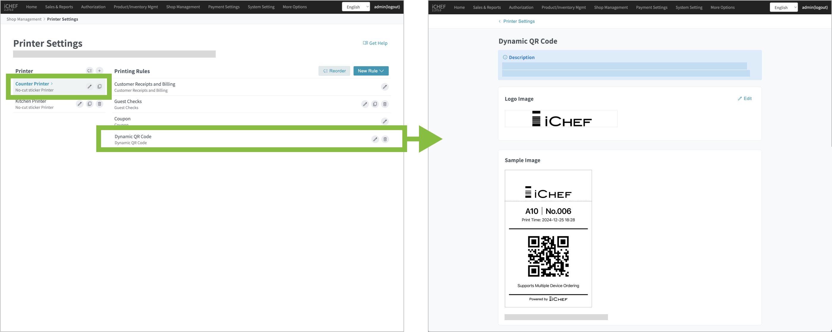 | How to print | iCHEF will generate a static QR Code for specific table from the backend. Download and print it, and then place it on the table. | iCHEF POS App will generate a dynamic QR Code accordingly after a dine-in order is created. Print it directly with the printer in your restaurant. |