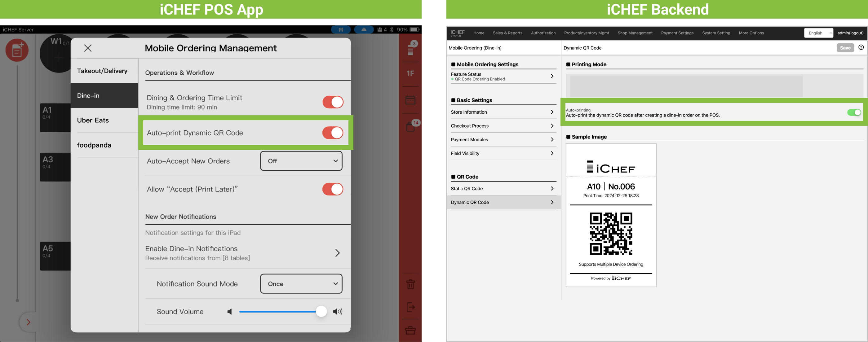 This function can be enabled on iCHEF POS App or in iCHEF’s backend. In this way, the system will generate and print a dynamic QR Code accordingly after a dine-in order is created, saving the time for manual print and facilitating your business operation!