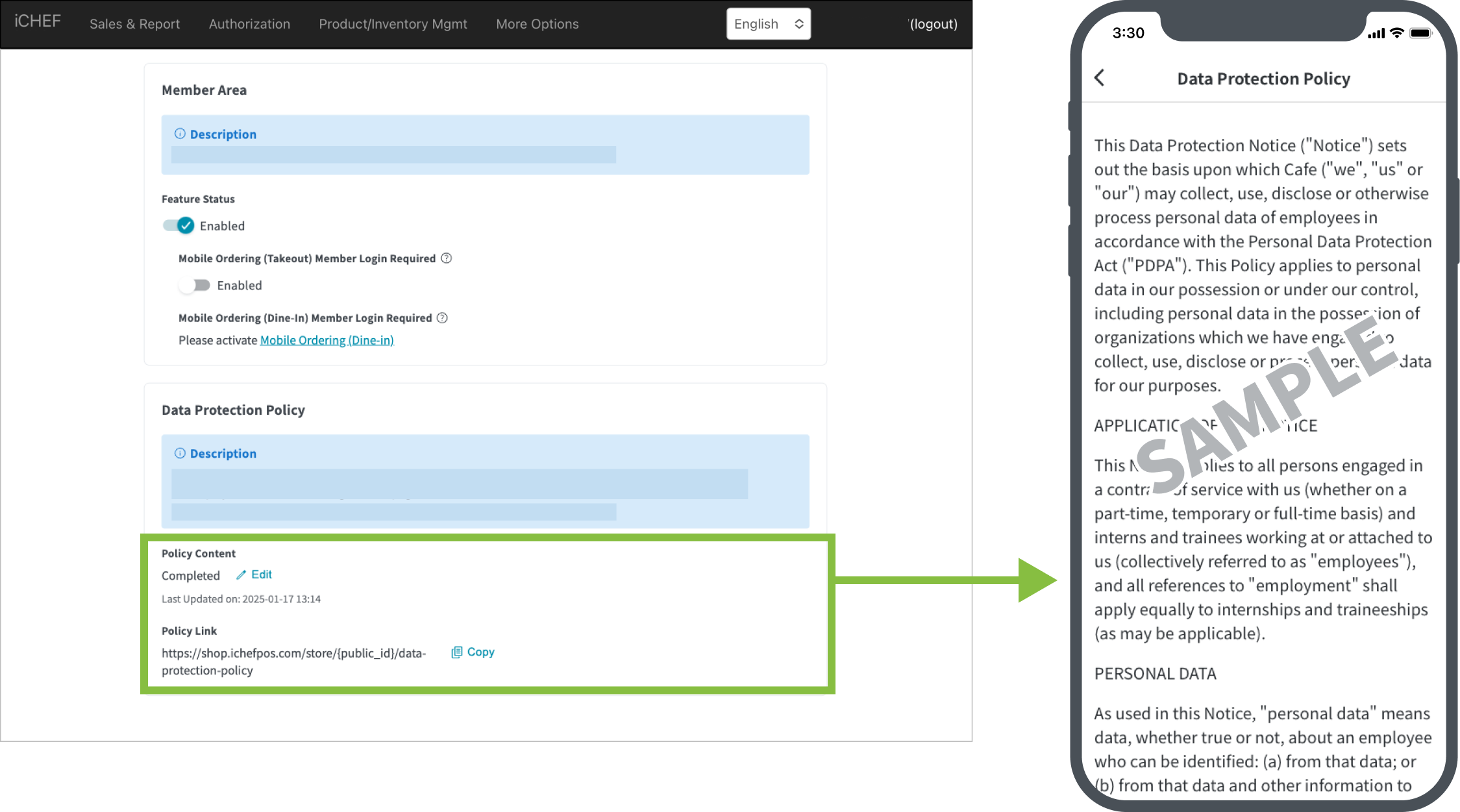 ➤ iCHEF Backend: Online Store > Website & Member Area > Data Protection Policy