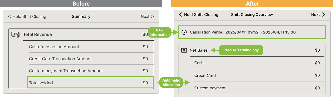The summary now shows the Time Range of the closing session, so you always know which sales are included. Also, any voided transactions will now be deducted from the correct payment method and reflected in your Net Sales (previously shown as “Total Revenue”).